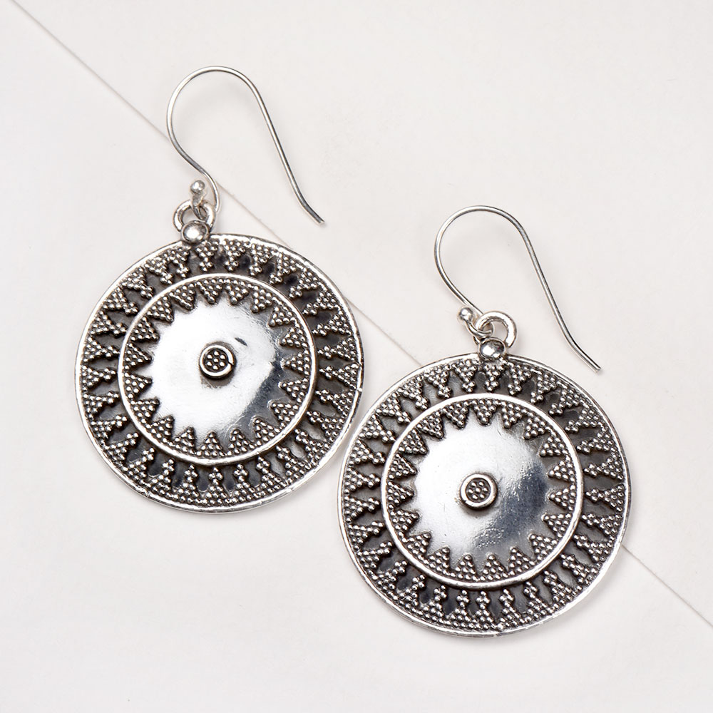 The round Dangle earrings are handmade by expert craftsmen of India .They have a unique design with detailed beaded silver work. Add a touch of the ethnic and exotic to your wardrobe with these dangle earrings. Great gifting option suitable for every day wear.