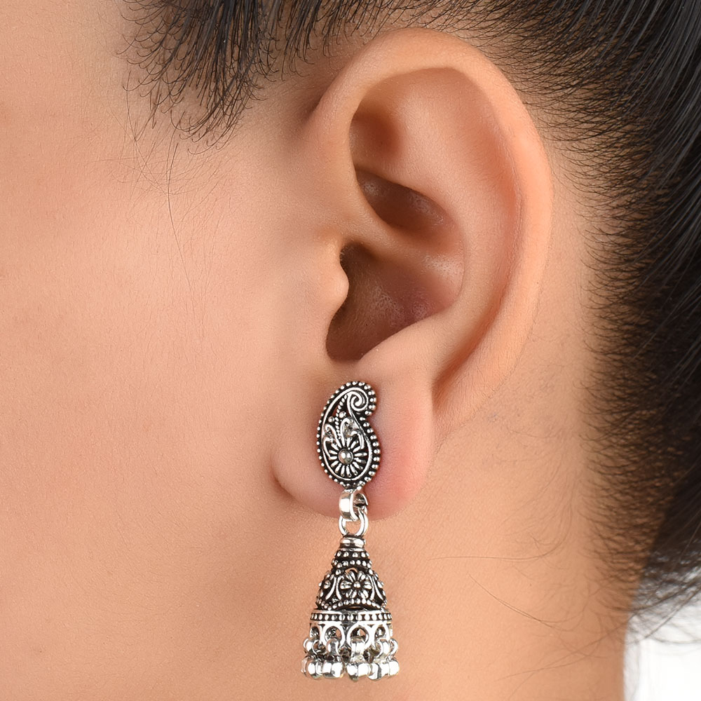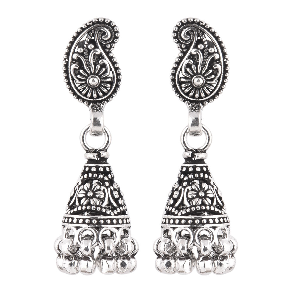 These 92.5 Sterling silver jhomkies can be worn at all auspicious function wedding, engagements or during the festival time. It can also be worn on regular basis. It has a lovely engraved Parsely top and embellished with metallic beads. An ideal present for your mother, sister or wife.