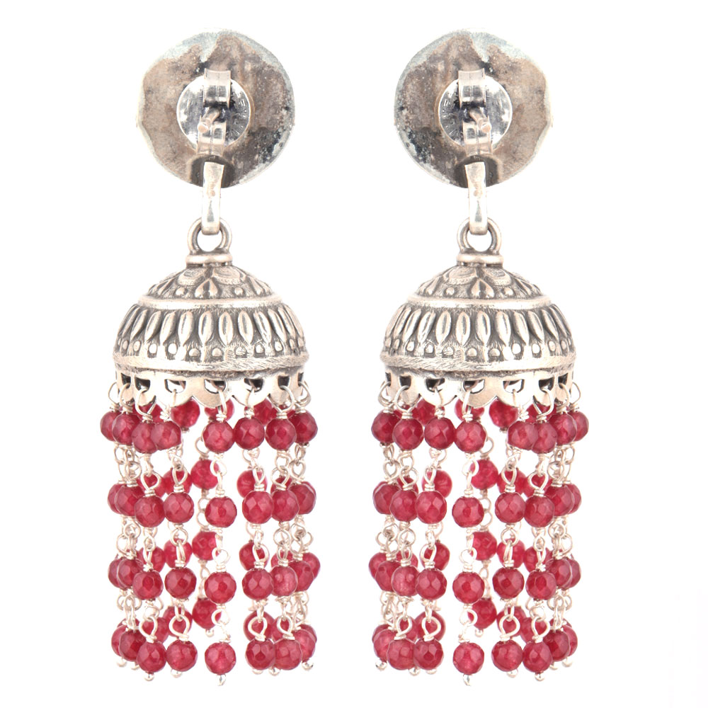 This earrings is actually is 92.5 Sterling Silver Jhumki Earrings handmade by the expert craftsmen of India. It has a unique stud with Sun god face with moustache and tassels made from tiny red onyx beads and silver attachments . Pair it with a nice sari, lehenga or traditional suit.