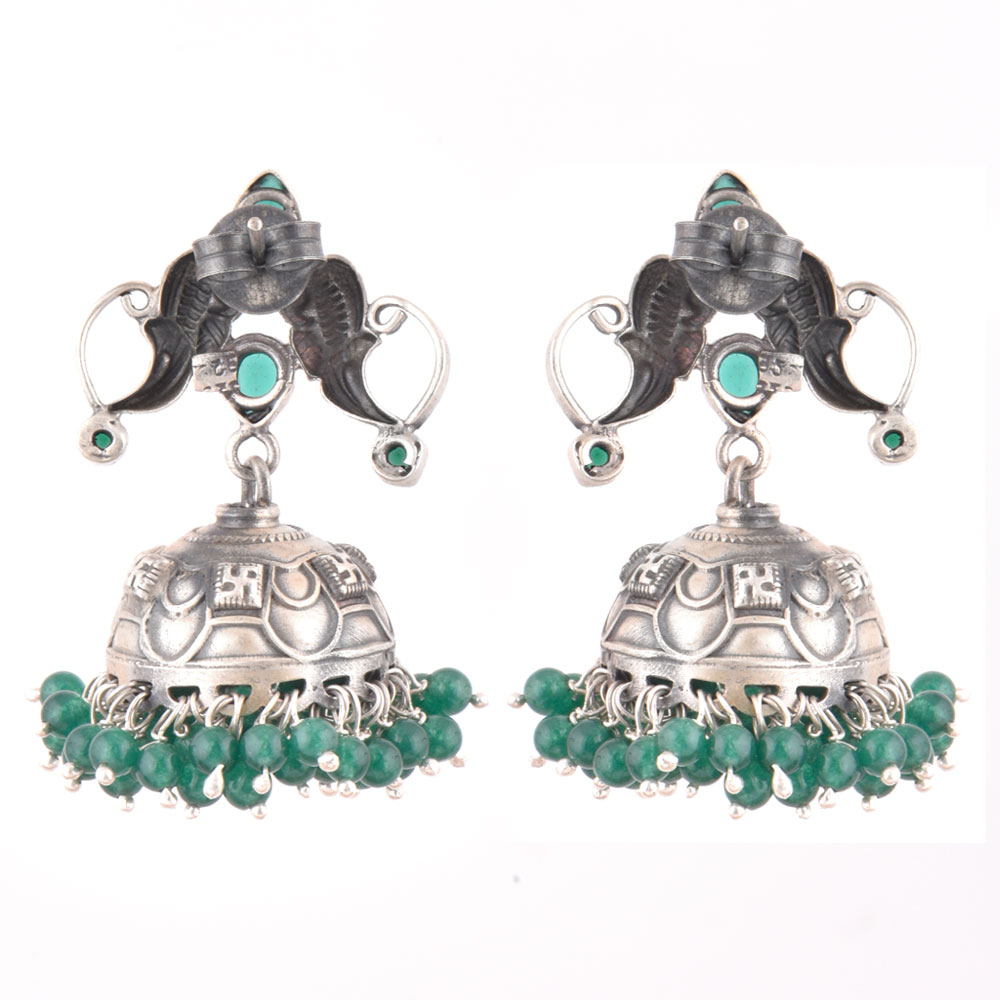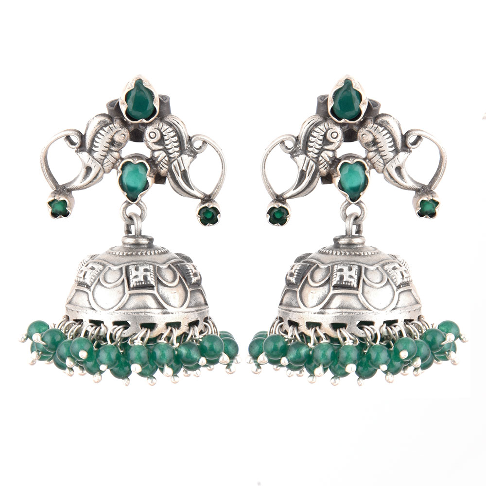 These 92.5 Sterling silver jhomkies can be worn at all auspicious function wedding, engagements or during the festival time. It can also be worn on regular basis. It has a lovely peacock motif top with green onyx beads. An ideal present for your mother, sister or wife.