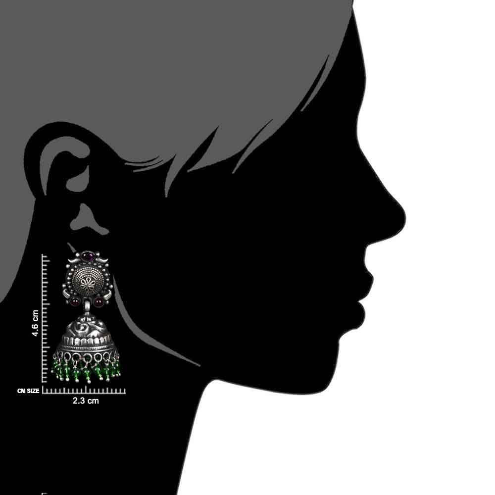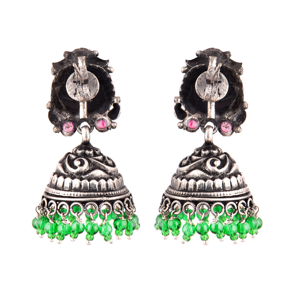 Bold And Bright 92.5 Sterling Silver Earrings with engraved design oxidized color decorated with fuchsia jade quartz and green onyx beads tassels to give color and beauty to simple jewelry. Wear it to special occasions or gift it to your near or dear ones.