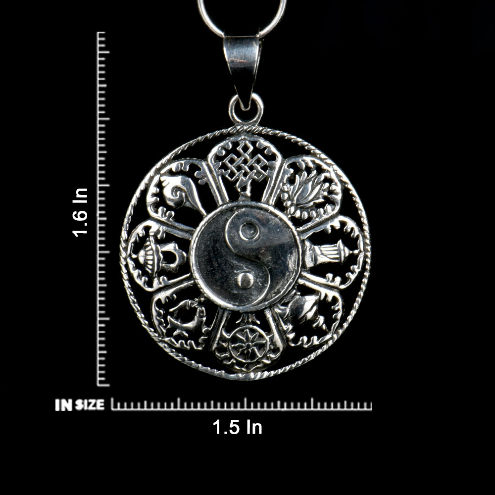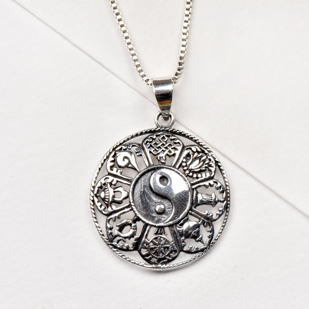 Handcrafted silver (92.5 sterling silver) pendant in a beautifully floral carved design pattern with feng shui symbol in the centre is handcrafted by Indian artisans and goes well with all traditional attire. It’s trendy fusion jewellery that can be worn on wedding, festival, party, and on any occasion.