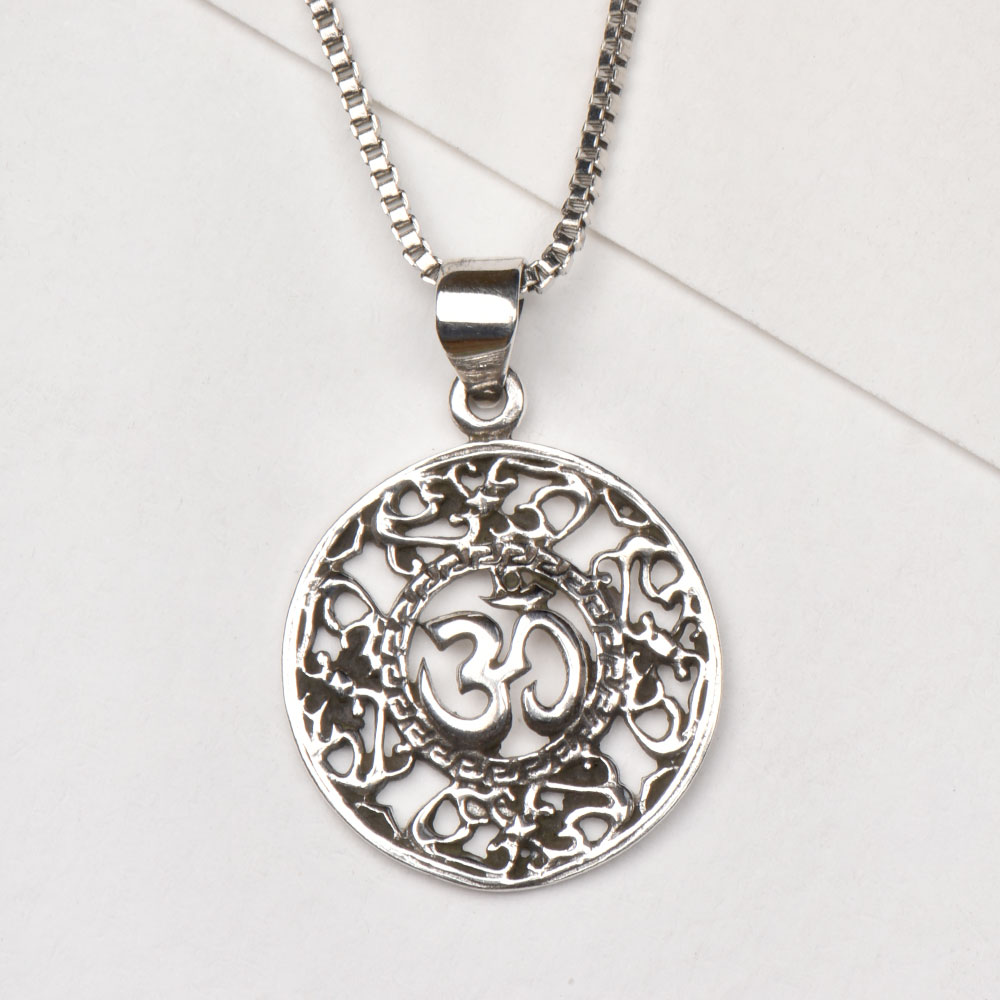 Adorn your necklace framed om symbol surrounded by intricate jail patterns floral design in sterling silver metal is handcrafted to perfection with a flawless finish. This radiant pendant is made from the finest 925 sterling silver that is the perfect treat for yourself or your friends and relatives.