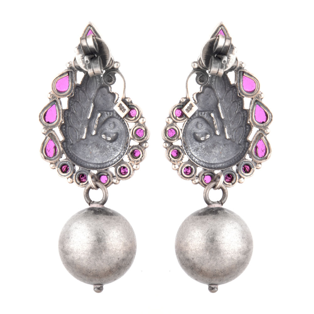 Oxidized silver metal in myriad patterns with pink tourmaline stone work , delicate carving and enameling these pieces have an old world charm and traditional appeal . It has a lovely peacock pattern engraved in silver with ball drop hanging .Ideal gift for women,diwali gift for girls, wedding jewellery and on the occasion karva chauth or other auspicious occasion.