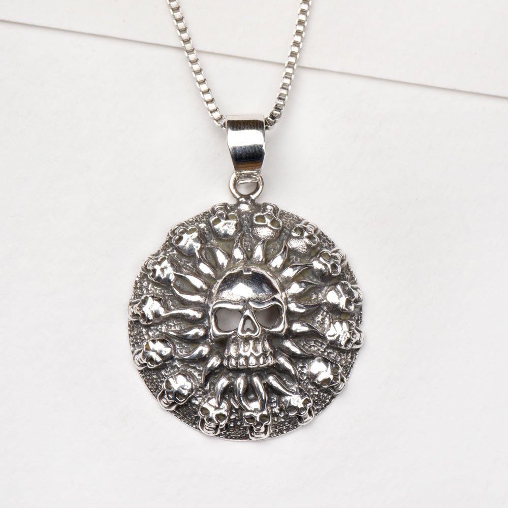92.5 Sterling Silver pendant with Human circle of skulls with a skull in center and many tiny cells in circular frame makes this pendant an extraordinary piece for someone who loves thrill adventure in life and want to be the centre of attention . It is a perfect piece for any occasion or social gathering. Ideal gifts for your girlfriend, wife, mom and daughter and treat yourself or someone special to it.