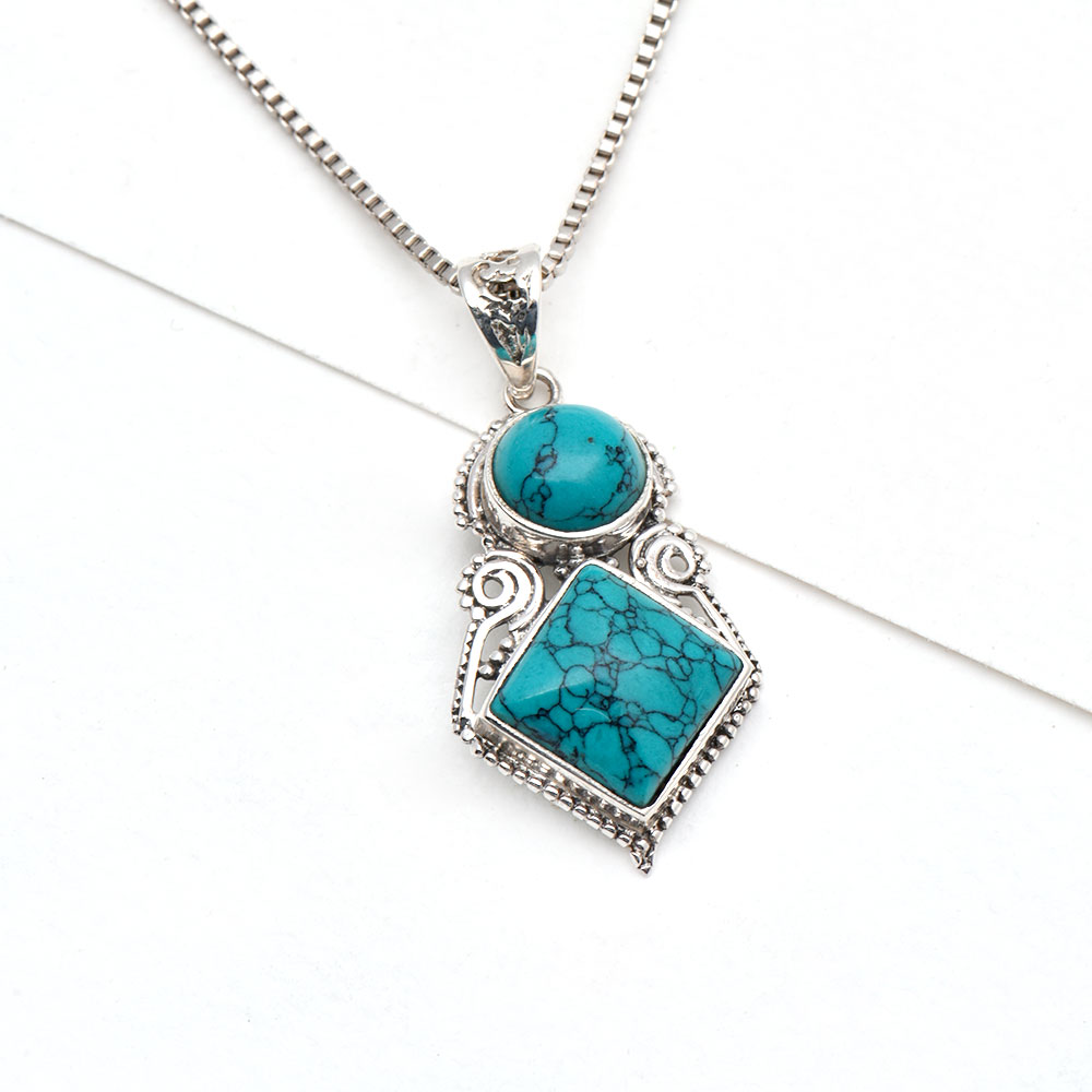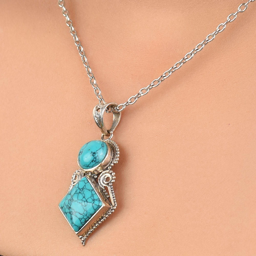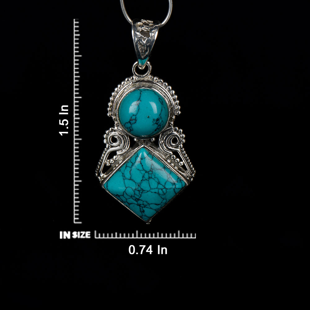Handmade by the Indian artisans the unique turquoise stone tiered design allows the pendant to move with you and shine elegant in the light. This piece is the perfect size to make a statement, while still being comfortable enough for everyday wear. Ideal for gifting and perfect for everyday or that special night out.