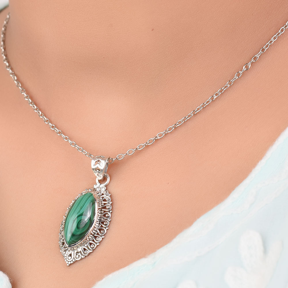 Dazzle everyone with our silver pendant chain for women made in 925 Sterling Silver and Semi-Precious Stone Green Malachite. Suitable for Any Season these pure silver pendant would make a great birthday gift, anniversary gift, mother's day gift, valentine's day gift, Christmas gift, wedding gift.