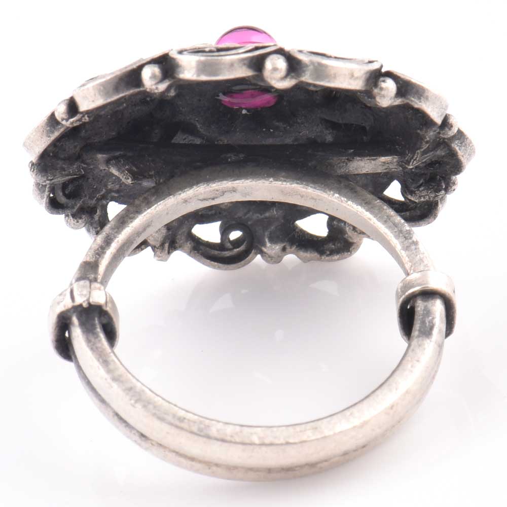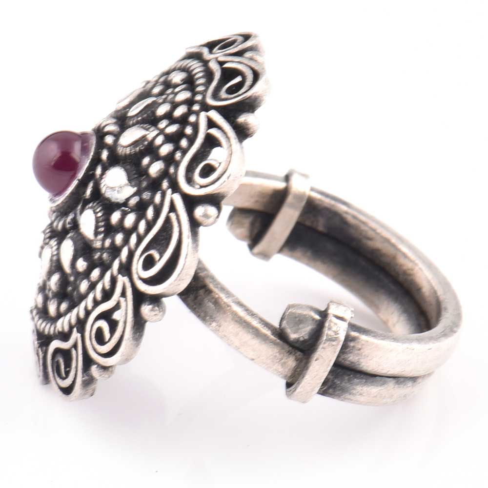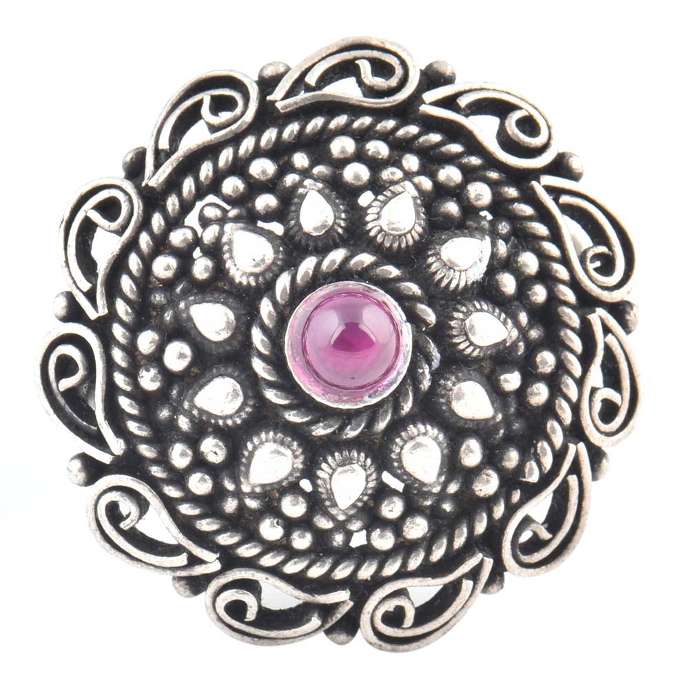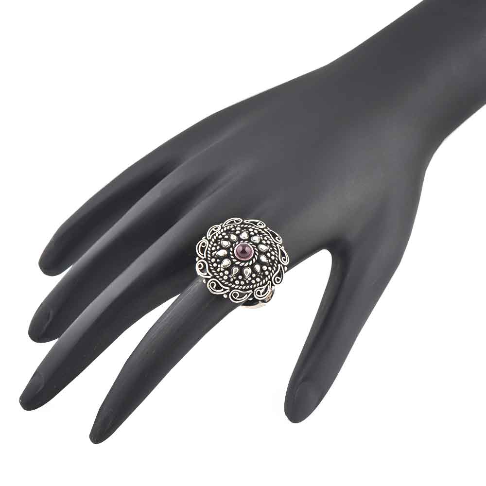 92.5 Sterling Silver Ring adjustable with round Amethyst with pear and dotted motifs and scroll design that makes it very classy and traditional . Gift it to your friend, mother , wife and sister on weddings, anniversary, raksha bandhan or birthdays.