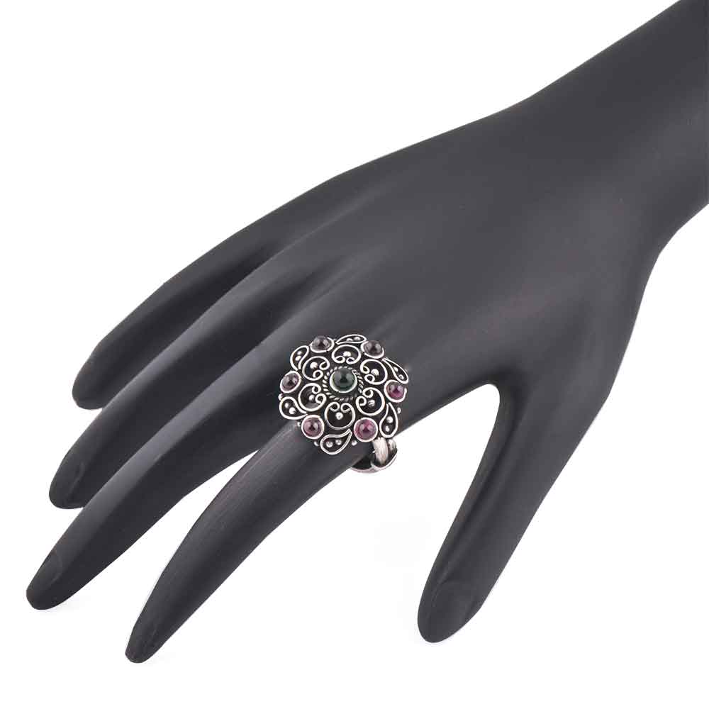 92.5 Sterling silver ring adjustable with elaborate design of floral and paisley design with amethyst and onyx stones studded ring .An exclusive ring for a formal function such as weddings, engagements , bridal shower, parting gift, souvenir or as a token of love . Can be worn by girls, sisters, wives and that someone special.