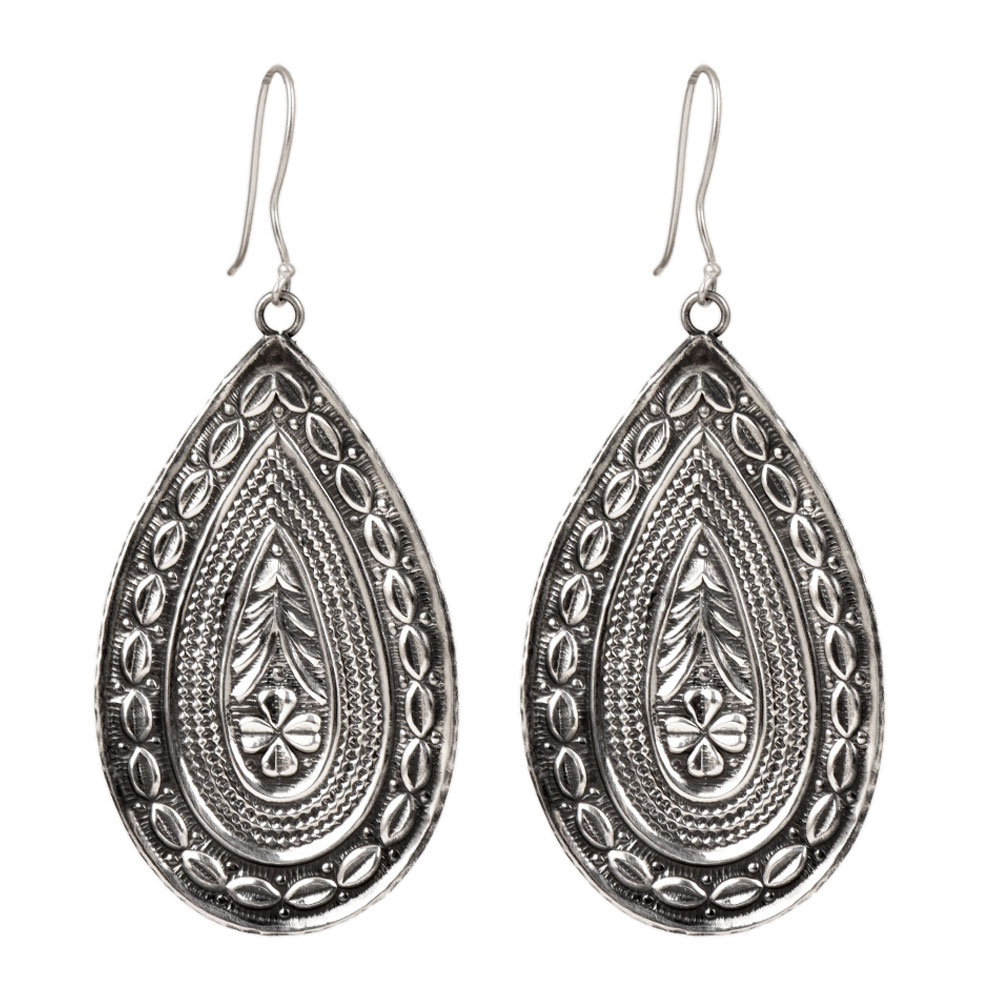 Handmade Sterling Silver dangle Oval Statement Earrings Ethnic style dark oxidized Silver Symbolic with engraved leafy and floral border pattern . Perfectly suited for Wedding, Ethnic, Festive Party wear.