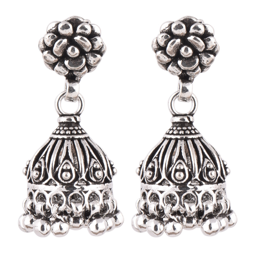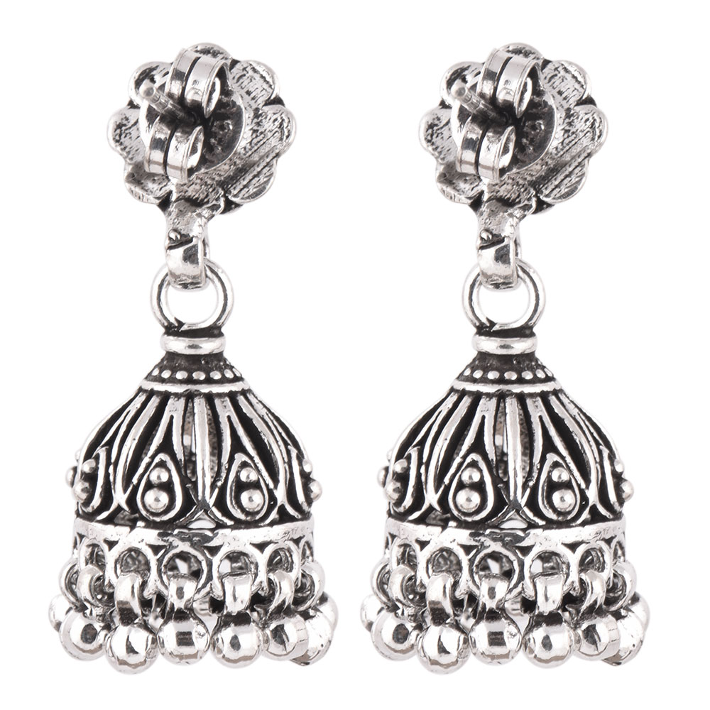 These 925 Sterling silver jhumkis can be worn at all auspicious function wedding, engagements or during the festival time. It can also be worn on regular basis. It has a lovely peacock motif top and embellished with metallic beads. An ideal present for your mother, sister or wife.