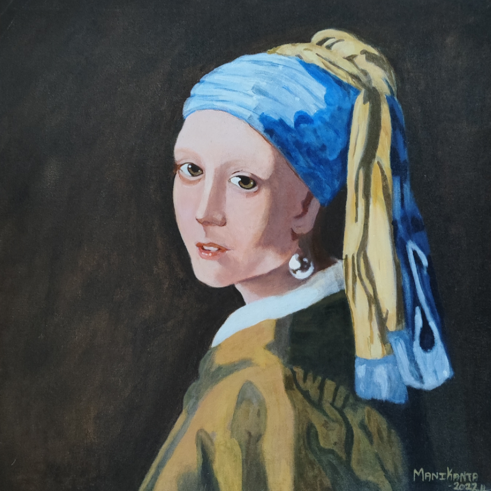 In this striking 44 x 39 cm acrylic on canvas reinterpretation, artist B. Manikanta offers a modern tribute to Johannes Vermeer’s iconic Girl with a Pearl Earring. The subject’s gentle gaze, luminous pearl earring, and flowing blue-and-gold turban are rendered with fresh clarity and painterly depth. Manikanta’s acrylic technique brings a smooth, contemporary vibrancy to the classical composition, allowing the viewer to connect anew with the quiet mystery and elegance of the girl’s ex pression. A captivating small-format portrait that bridges timeless beauty with modern craftsmanship—ideal for collectors of classic-inspired figurative art.