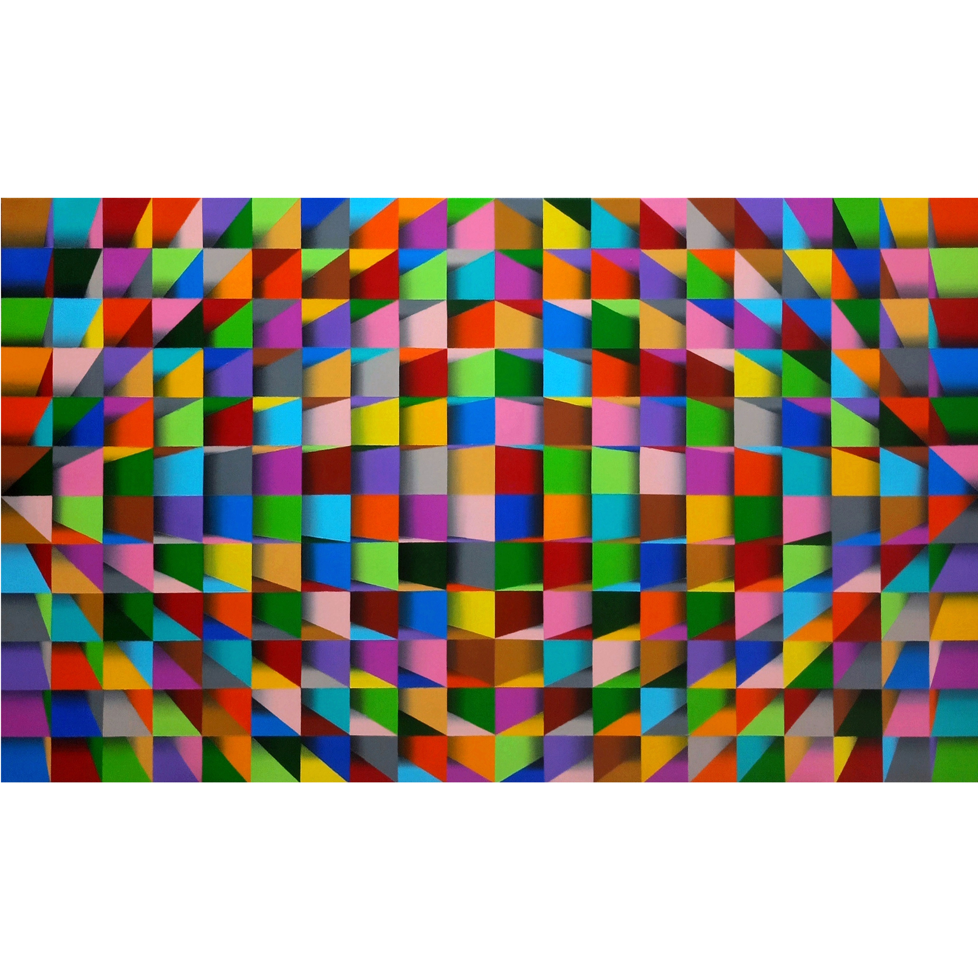 "A Grand Celebration" is a lively and captivating acrylic on canvas painting that captures the spirit of festivity and joy through a brilliant symphony of geometric shapes and radiant colors. The precise alignment of squares and triangles creates a rhythmic pattern, reflecting movement, unity, and shared excitement reminiscent of joyous gatherings. Rich and varied shades—including vibrant blues, lush greens, warm reds, soft purples, and lively yellows—intermingle in harmonious balance, evoking feelings of exuberance and collective celebration. The visual depth and perspective draw viewers into the festive atmosphere, while the bold, structured composition symbolizes the diverse yet cohesive energy of a grand communal event. "A Grand Celebration" embodies the beauty and vibrancy that emerge when people unite to commemorate life's most cherished moments.