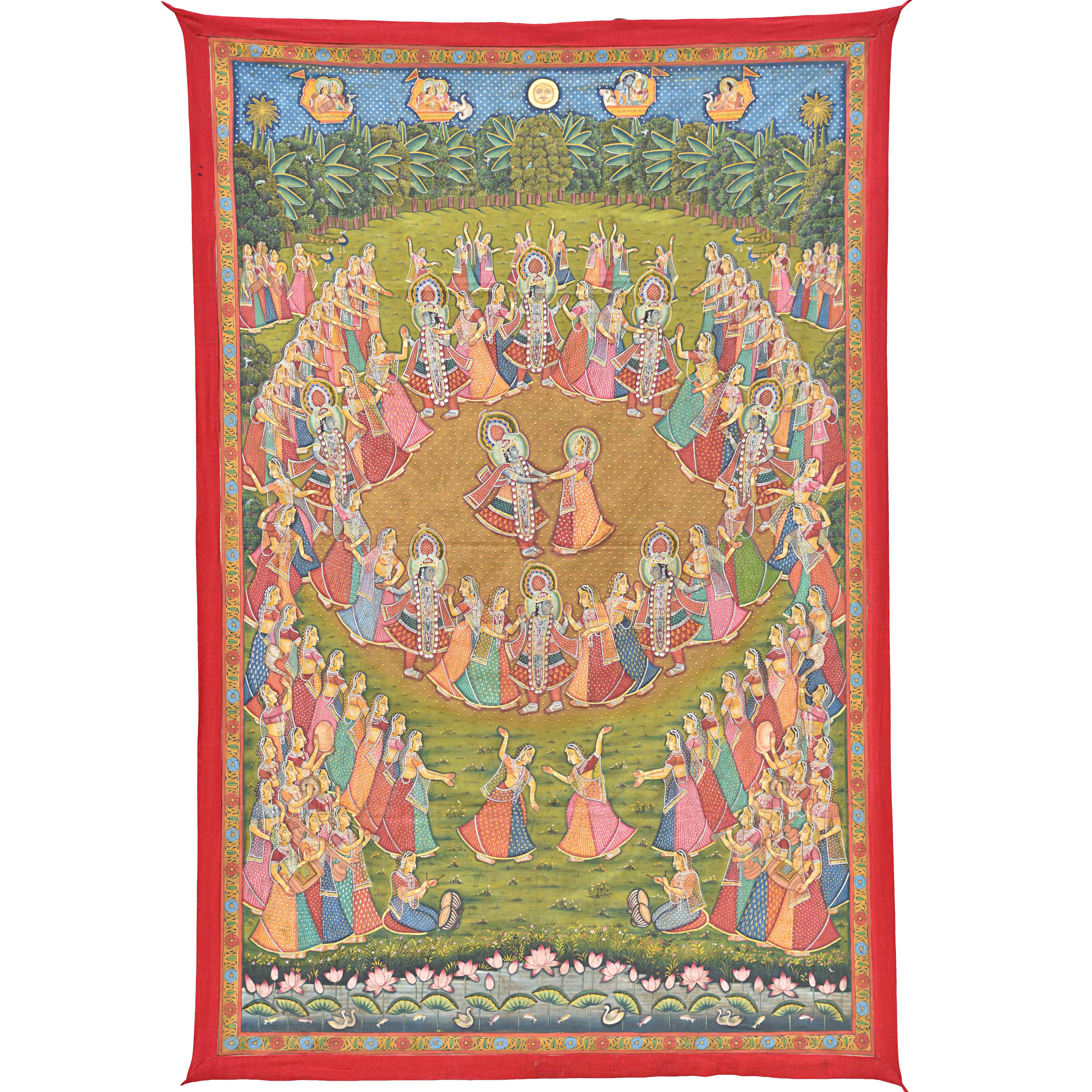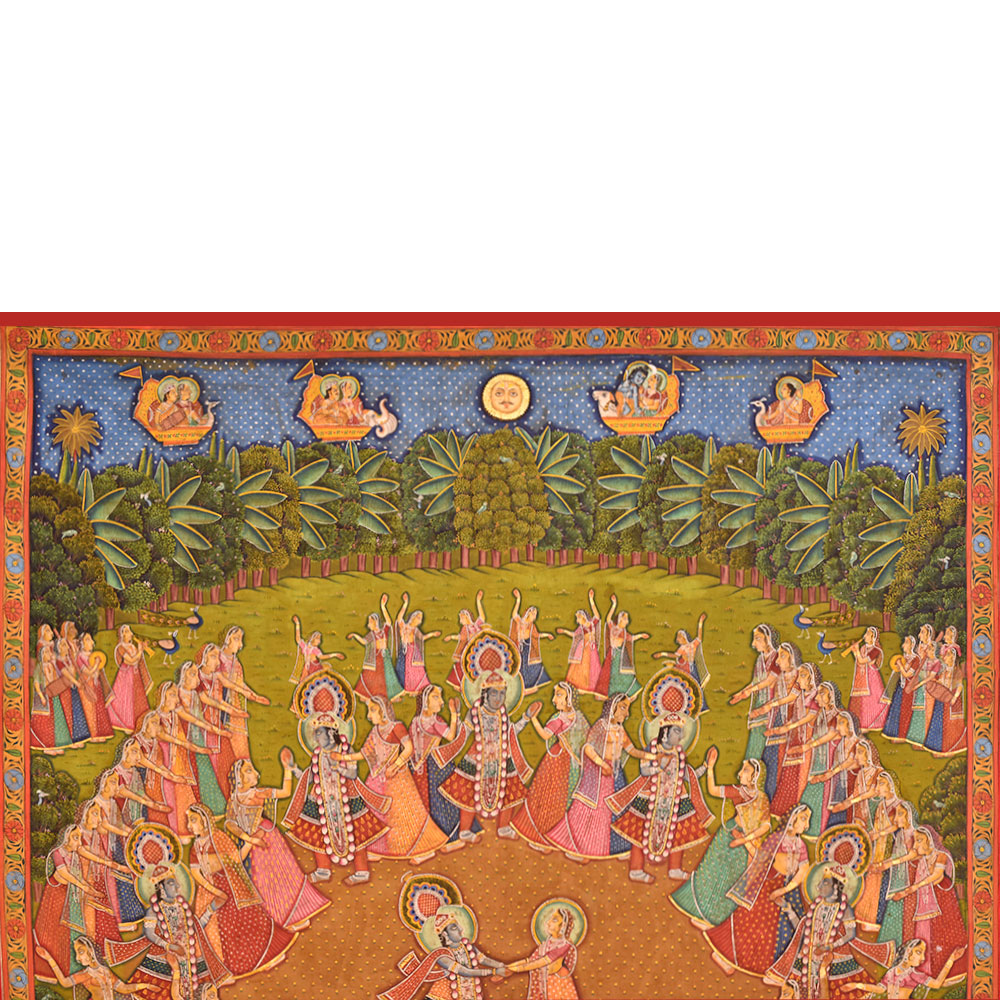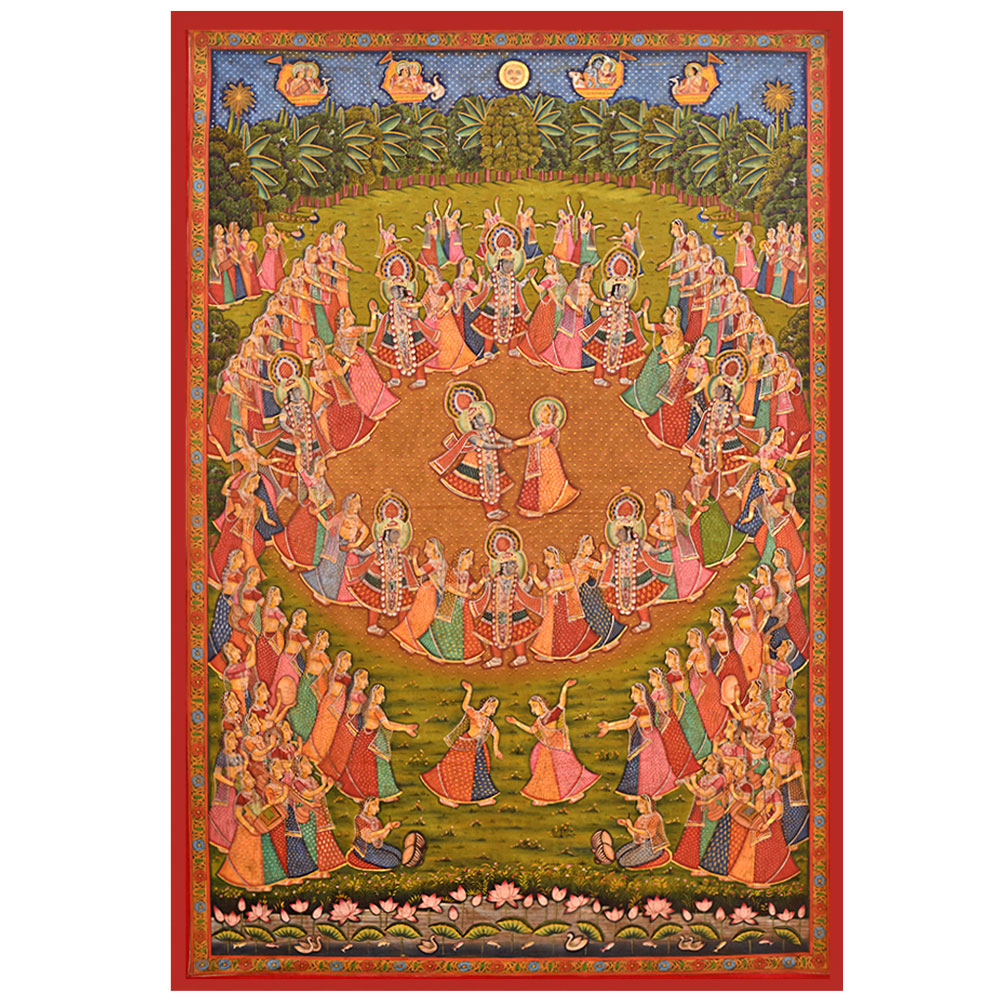 Finely detailed and impeccably striking ,Lord ShrinathJi Pichwai Painting showcasing the Lord and the Gopis performing a Raas Leela. Every detail in the painting has been taken care of with great precision and expertise.