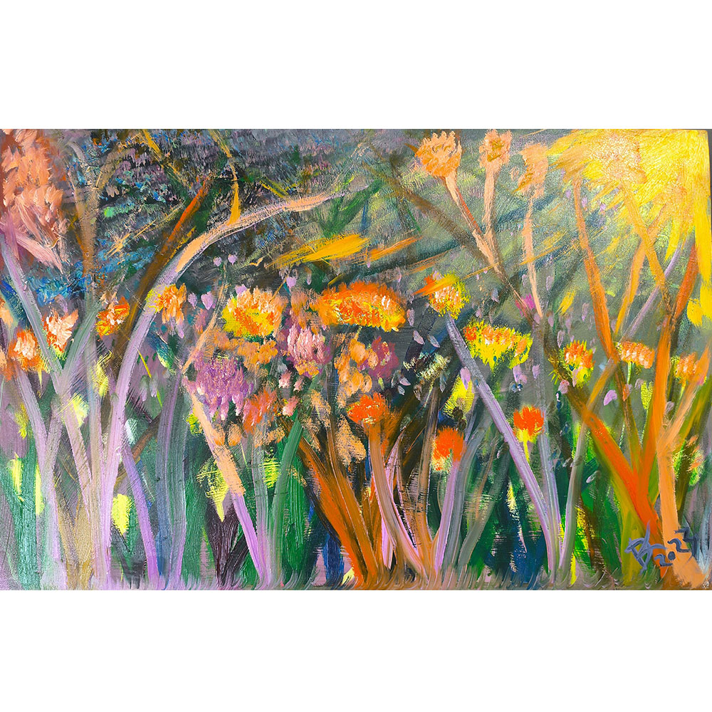 This expressive oil painting on stretched canvas bursts with the untamed beauty of a wild garden glowing in dappled sunlight. Bold, sweeping strokes of lavender, green, orange, and yellow create a rhythmic dance of stems and blossoms, evoking a lush forest floor ablaze with springtime energy. The layered texture and dynamic composition give the impression of movement, as if the flowers are swaying gently in a warm breeze. Radiating warmth, vitality, and natural wonder, this artwork is a joyful celebration of nature’s spontaneous beauty—perfect for brightening up contemporary interiors with a touch of wild serenity.