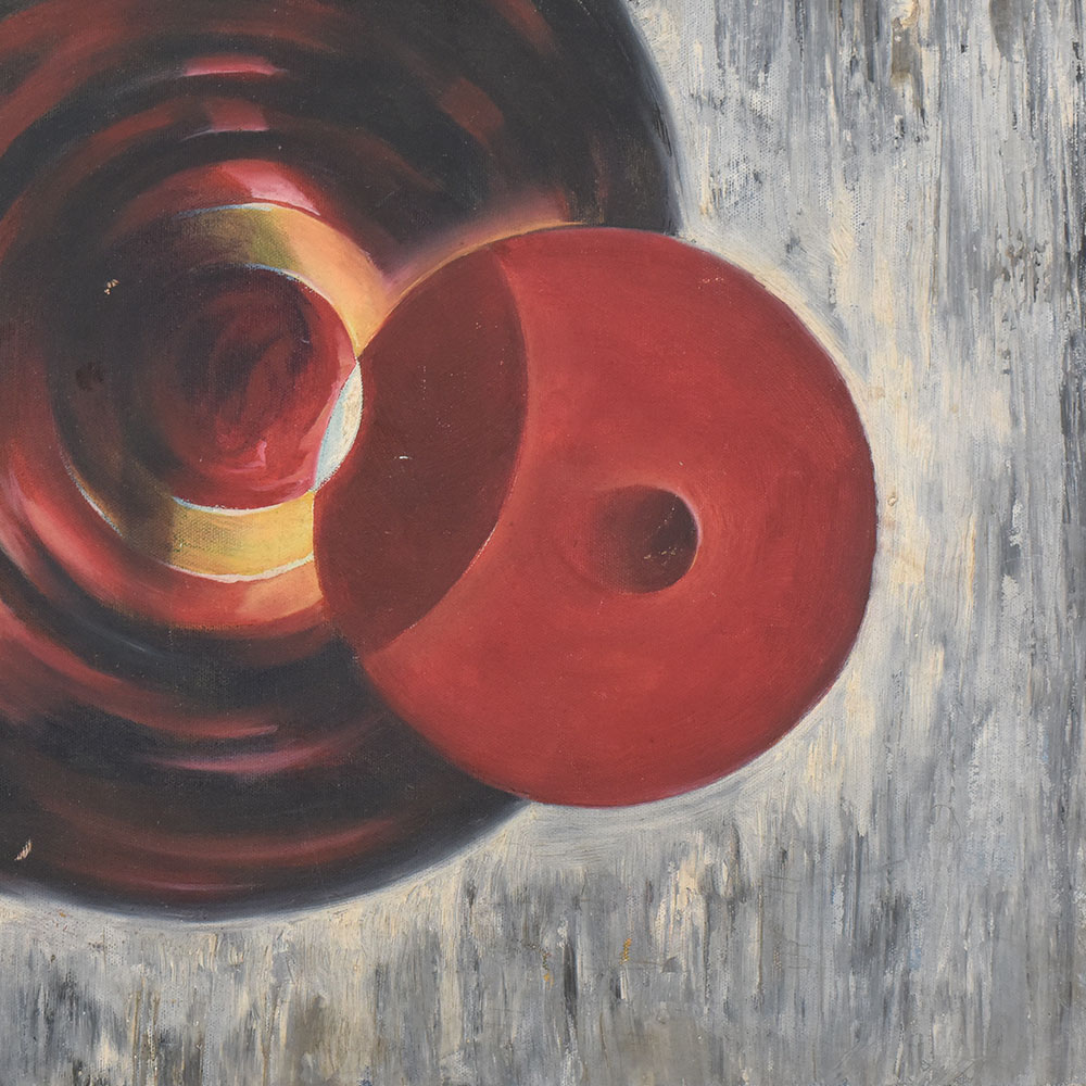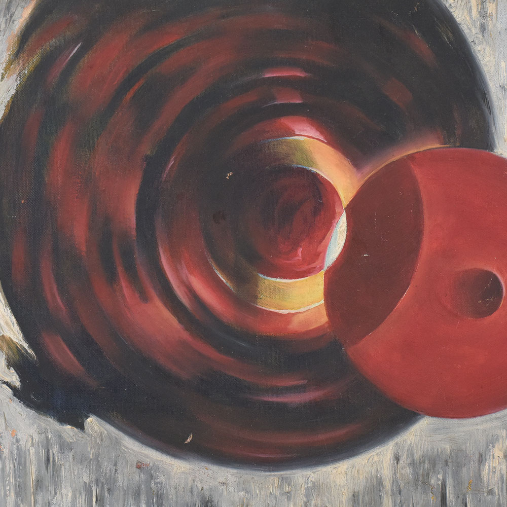Add a bold statement to your decor with this abstract cloth painting on hardboard, featuring striking red circular forms set against a textured gray backdrop. The artwork explores depth, movement, and contrast through swirling patterns and layered shapes, creating a captivating visual experience. With its modern abstract style, the painting evokes interpretations of cosmic energy, motion, and balance, making it a versatile piece for both contemporary and eclectic interiors. Crafted on cloth and mounted securely on durable hardboard, the painting combines artistic elegance with long-lasting quality. Its vibrant color palette of deep reds and subtle highlights ensures it stands out as a centerpiece in any space. Perfect for living rooms, offices, studios, or art collections, this abstract painting adds sophistication and a sense of intrigue.