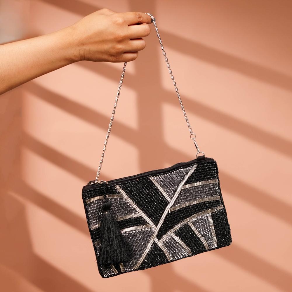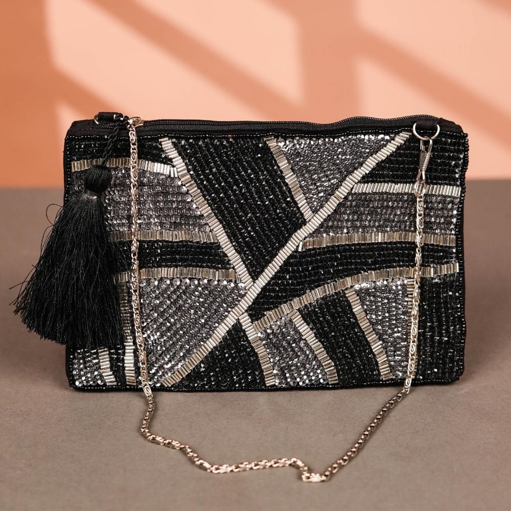 This monochrome cotton and beads handbag is a wearable work of art. Featuring sleek diagonal patterns in a blend of silver, black, and grey beads, it offers a structured yet edgy look. The compact silhouette and soft black tassel make it stylish and easy to carry, while the silver chain strap ensures a hint of sparkle. A flawless choice for minimalist yet bold styling.