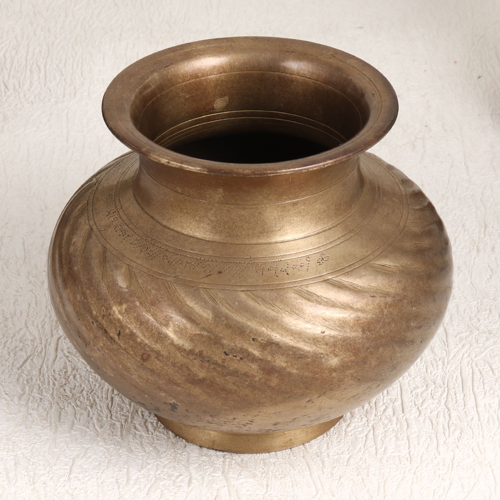 Enhance your sacred rituals and interior decor with our exquisite Vintage Brass Holy Water Pot. Handmade by professional Indian craftsmen in the rich tradition of South Indian Art, this piece is a testament to their craftsmanship and heritage. The pot features an intricate embossed line pattern, adding a touch of elegance to its antique brown finish. Made from high-quality brass, it exudes durability and timeless beauty. Versatile in its use, this holy water pot can grace your home, office, restaurant, hotel, cafe, or shop as a captivating decorative element. During havan or worship ceremonies, it serves as a graceful vessel for holding holy water, enhancing the sanctity of your rituals. Temples can also benefit from its presence during prayers. For collectors, it's a prized addition to your vintage collection, and for exhibitors, a captivating display piece. Moreover, it makes for a thoughtful gift on special, festive, or auspicious occasions, symbolizing blessings and enduring craftsmanship.