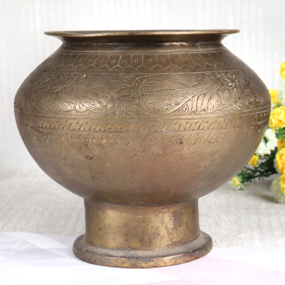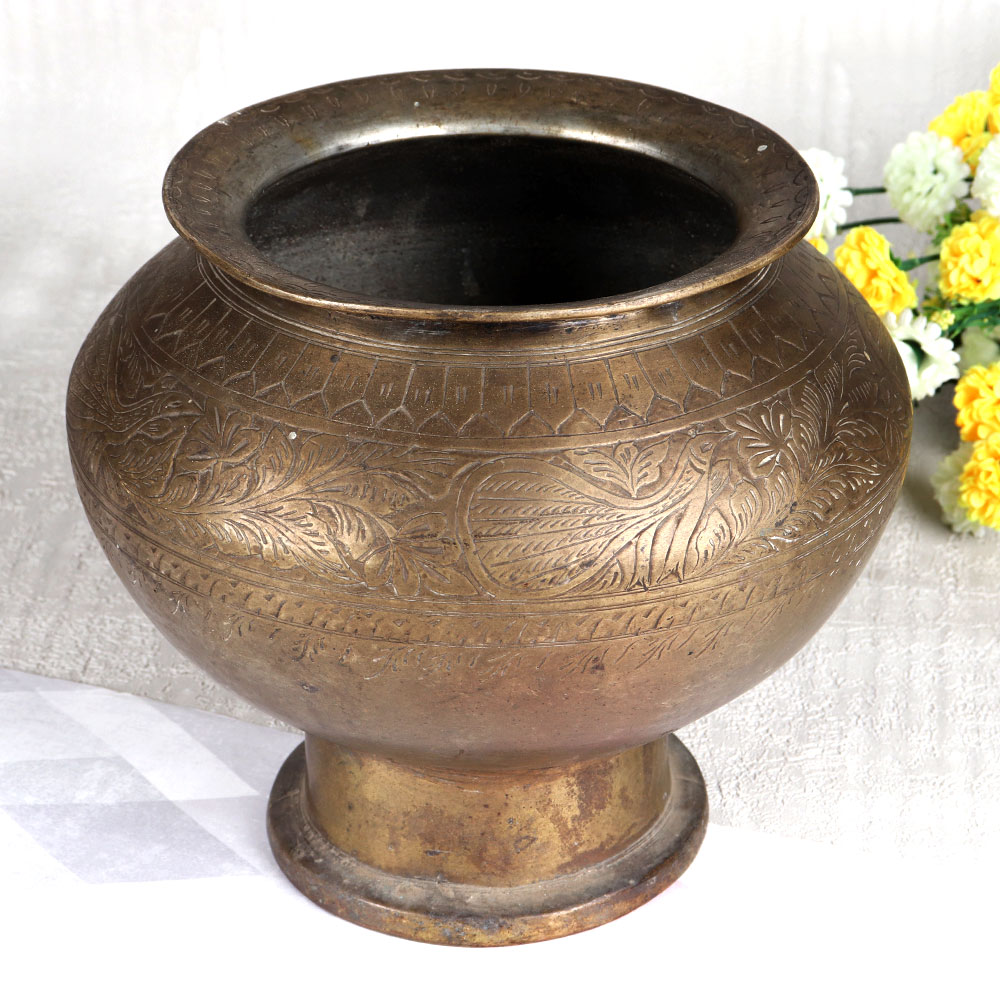 Buy a Vintage Brass Cooking Pot online that is a true masterpiece of craftsmanship featuring stunning engravings in an antique brown finish. Handcrafted by talented Indian artisans hailing from the cultural heartland of Gujarat, this brass pot embodies the rich heritage and artistry of the region. Crafted with meticulous attention to detail, this cooking pot is made from high-quality brass, ensuring its durability and timeless charm. While it may have once graced the kitchens of yesteryears, we recommend reserving it for decorative purposes due to its vintage nature. Its unique character and history make it a perfect addition to your vintage collection, exhibition display, or a cherished gift for your family, friends or relatives during special, festive, or auspicious occasions. Versatile and elegant, this brass pot can adorn any setting, be it your home, office, restaurant, hotel, cafe, or shop. Whether used as a captivating decoration piece or repurposed as a flower pot, it will add a touch of timeless sophistication to any space.