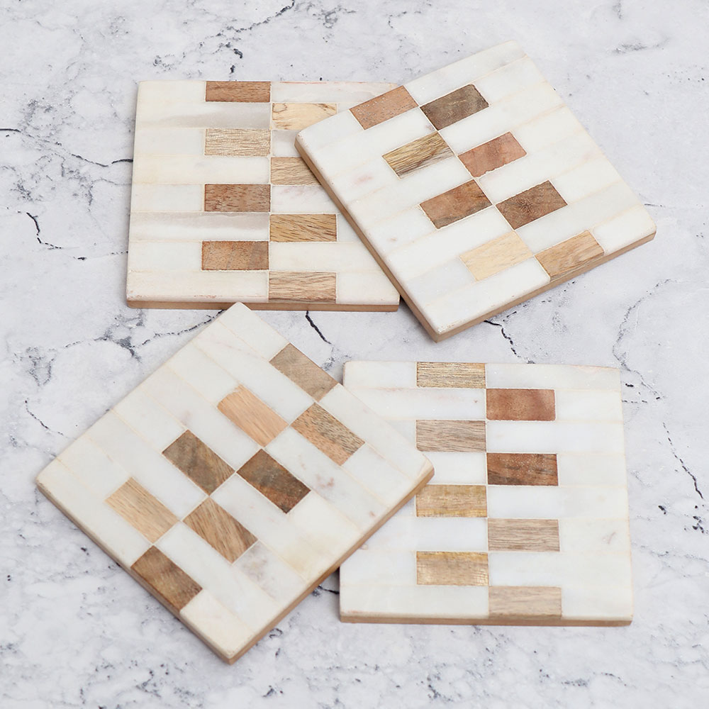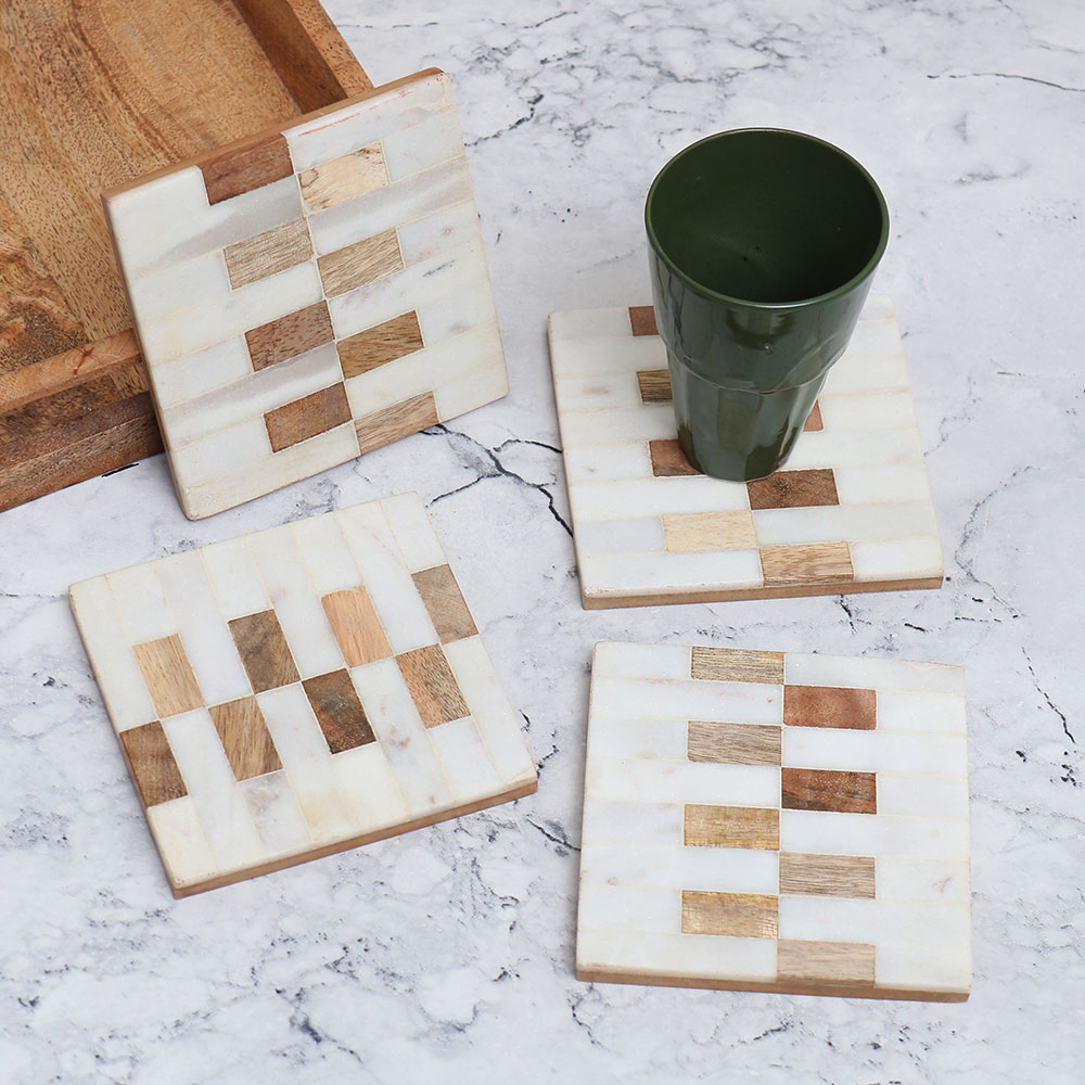 Buy a Pack of 4 wooden coasters which is crafted from premium-quality wood by professional Indian artisans. These square-shaped coasters are a perfect blend of elegance and functionality, designed to enhance your dining experience. Each coaster features a mesmerizing brown and white coloured pattern, beautifully hand-painted with utmost precision. The antique finish adds a touch of sophistication, making it a captivating decorative piece for your home or office. These wooden coasters are not only visually appealing but also practical. They serve as an ideal companion for your water, tea, juice, or coffee glasses, effectively preventing unsightly stains on any surface. Whether at home, office, restaurant, hotel, or cafe, these coasters effortlessly combine style and utility. Looking for the best wooden coaster set? Look no further! Our wooden tea coaster set embodies craftsmanship at its finest. Its timeless design makes it a versatile gift for your near and dear fours on special or festive occasions.