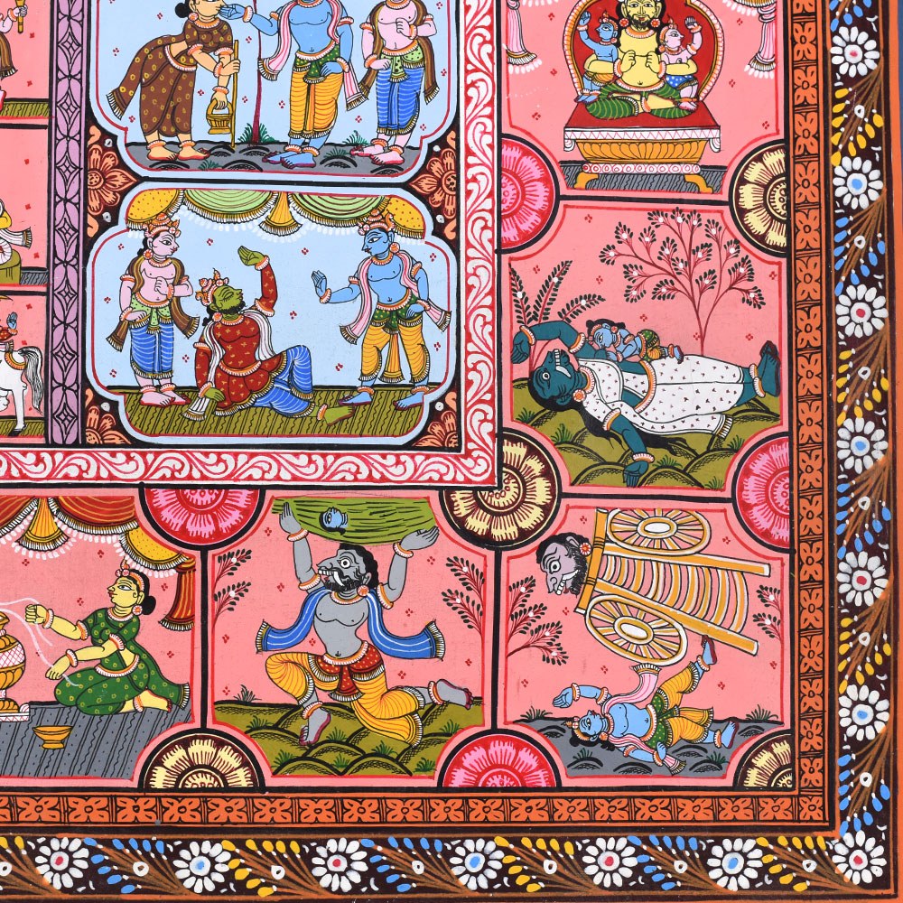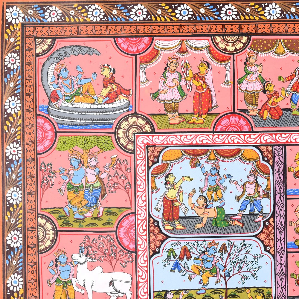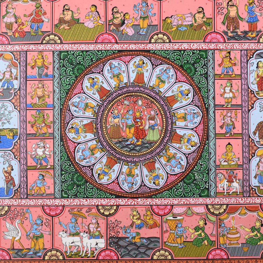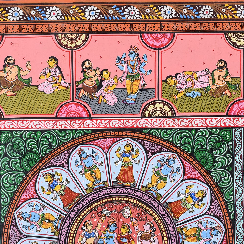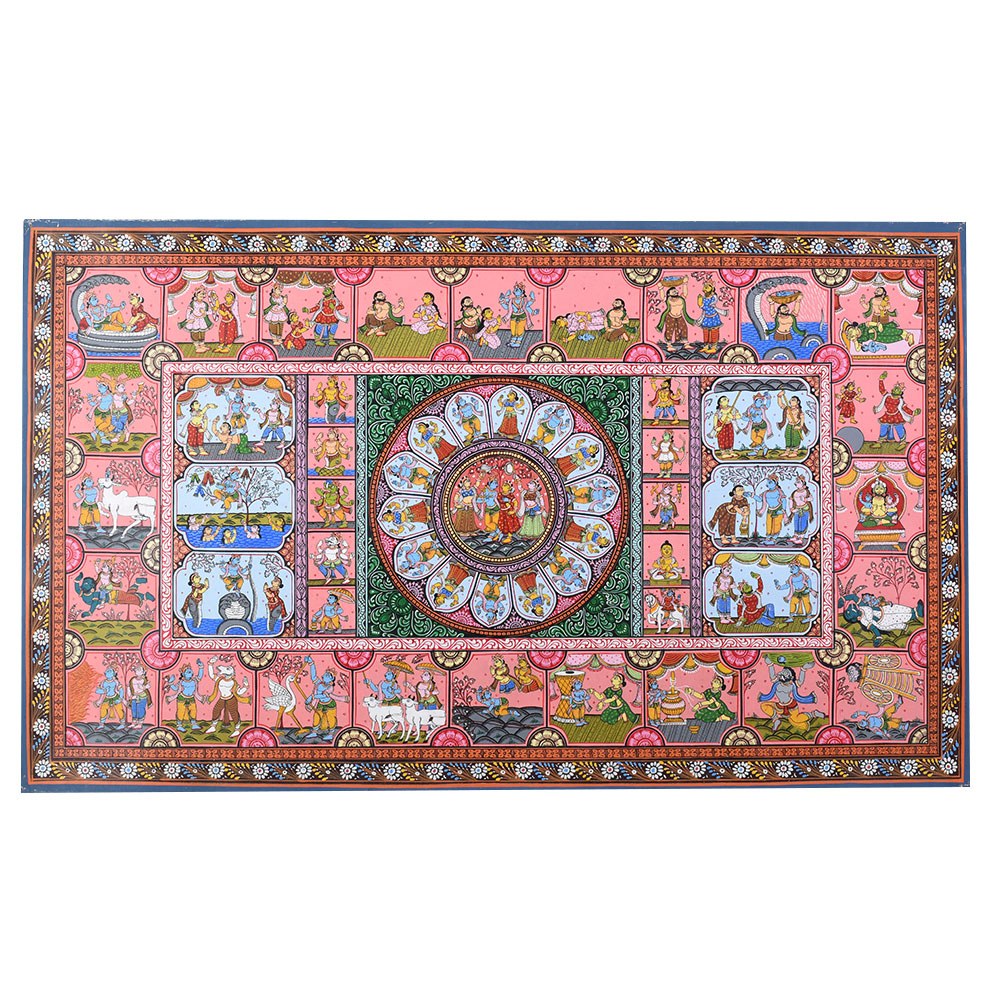 This Pattachitra painting intricately narrates the life and divine acts (Leela) of Lord Krishna, combining depictions of his childhood miracles with representations of the Dashavatara, the ten principal incarnations of Lord Vishnu, of whom Krishna is the eighth. The painting is divided into multiple sections, each highlighting different aspects of Krishna’s life and the diverse forms of Vishnu, showcasing the artist's skill in weaving multiple narratives into a cohesive visual story. The center of the painting features a beautiful circular depiction of Lord Krishna with Radha, surrounded by divine elements. This central motif represents the eternal divine love and the union of the divine masculine and feminine energies, symbolized by Krishna and Radha. This focal point underscores the spiritual connection between Krishna and his devotees, a recurring theme in his life, particularly with the gopis of Vrindavan. Surrounding the central circle are panels illustrating significant events from Krishna's life. Each of these scenes is filled with vibrant colors like reds, yellows, and greens, which are typical of Pattachitra paintings and serve to evoke the lively and divine nature of Krishna's actions. To the left and right of the central motif, the Dashavatara, or ten incarnations of Vishnu, is depicted in intricate detail. Each panel portrays one of the ten incarnations, beginning with Matsya (the fish) and ending with Kalki (the future incarnation). This representation not only underscores Krishna's divine origin as an avatar of Vishnu but also connects his life story to the broader cosmic narrative of Vishnu's interventions in the world to restore dharma (righteousness) whenever it is threatened by adharma (unrighteousness). The bottom panels of the painting depict Krishna’s connection with his devotees, including scenes of him playing his flute, surrounded by cows, as well as interactions with his beloved Radha. His role as a protector and guide for his devotees is highlighted through various depictions of his miracles and wisdom. The use of the Pattachitra style, with its intricate borders, geometric patterns, and fine detailing, adds depth and elegance to the narrative. This painting, with its spiritual significance, not only captures the divine life of Krishna but also beautifully integrates the concept of Vishnu’s various avatars, making it a timeless piece of devotional art.