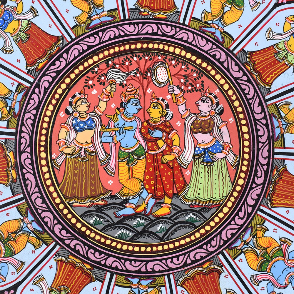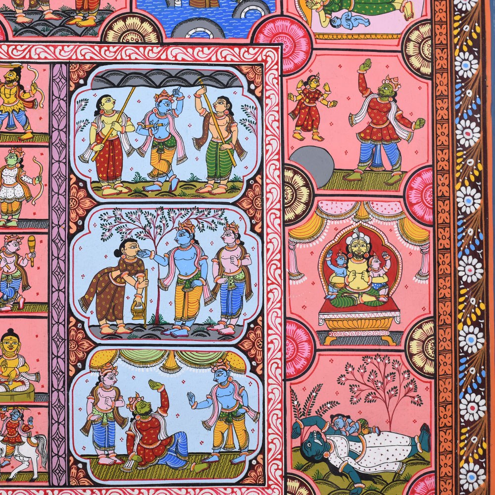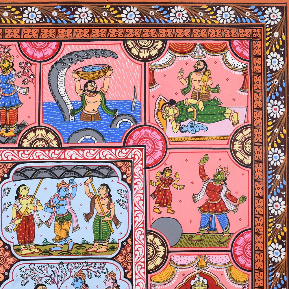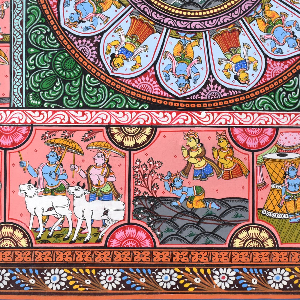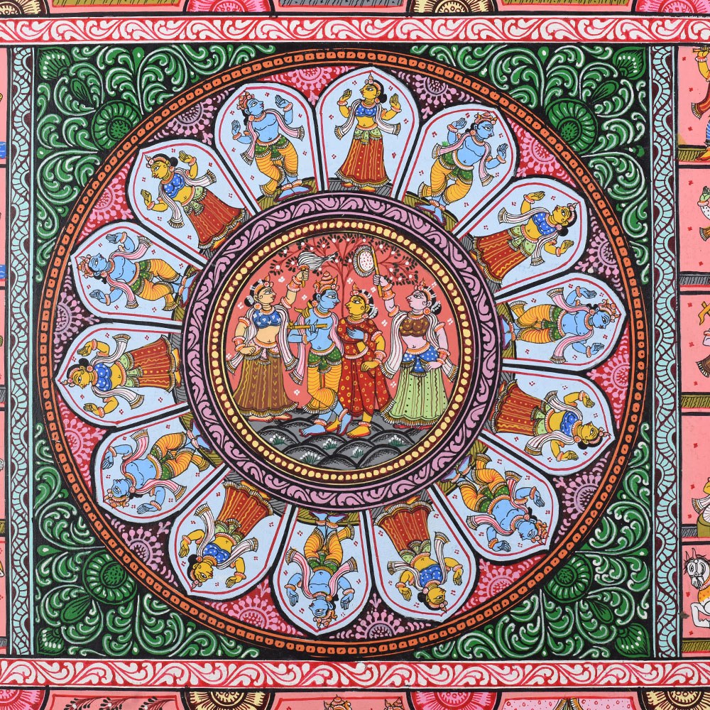 This Pattachitra painting intricately narrates the life and divine acts (Leela) of Lord Krishna, combining depictions of his childhood miracles with representations of the Dashavatara, the ten principal incarnations of Lord Vishnu, of whom Krishna is the eighth. The painting is divided into multiple sections, each highlighting different aspects of Krishna’s life and the diverse forms of Vishnu, showcasing the artist's skill in weaving multiple narratives into a cohesive visual story. The center of the painting features a beautiful circular depiction of Lord Krishna with Radha, surrounded by divine elements. This central motif represents the eternal divine love and the union of the divine masculine and feminine energies, symbolized by Krishna and Radha. This focal point underscores the spiritual connection between Krishna and his devotees, a recurring theme in his life, particularly with the gopis of Vrindavan. Surrounding the central circle are panels illustrating significant events from Krishna's life. Each of these scenes is filled with vibrant colors like reds, yellows, and greens, which are typical of Pattachitra paintings and serve to evoke the lively and divine nature of Krishna's actions. To the left and right of the central motif, the Dashavatara, or ten incarnations of Vishnu, is depicted in intricate detail. Each panel portrays one of the ten incarnations, beginning with Matsya (the fish) and ending with Kalki (the future incarnation). This representation not only underscores Krishna's divine origin as an avatar of Vishnu but also connects his life story to the broader cosmic narrative of Vishnu's interventions in the world to restore dharma (righteousness) whenever it is threatened by adharma (unrighteousness). The bottom panels of the painting depict Krishna’s connection with his devotees, including scenes of him playing his flute, surrounded by cows, as well as interactions with his beloved Radha. His role as a protector and guide for his devotees is highlighted through various depictions of his miracles and wisdom. The use of the Pattachitra style, with its intricate borders, geometric patterns, and fine detailing, adds depth and elegance to the narrative. This painting, with its spiritual significance, not only captures the divine life of Krishna but also beautifully integrates the concept of Vishnu’s various avatars, making it a timeless piece of devotional art.