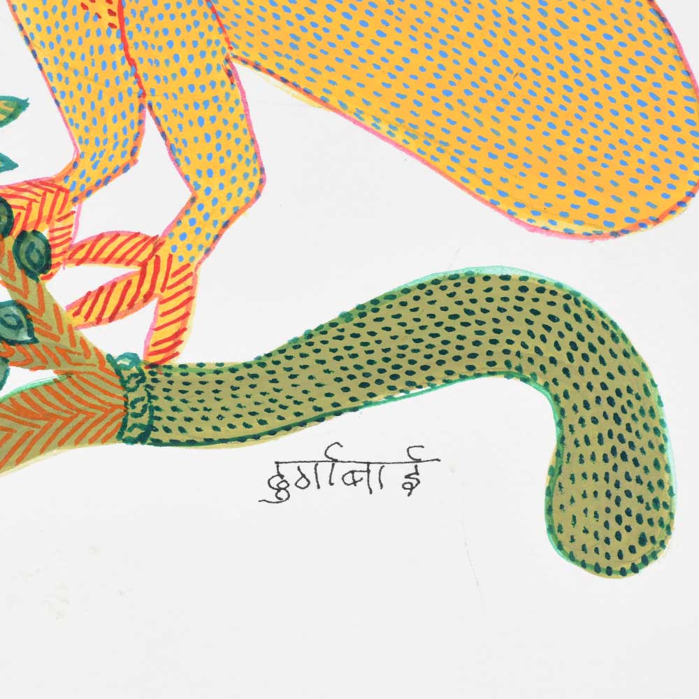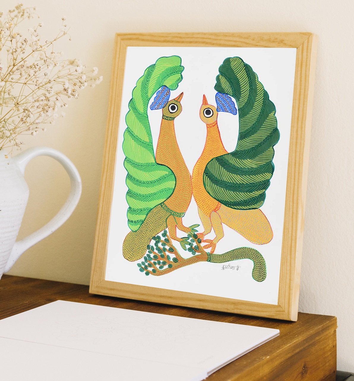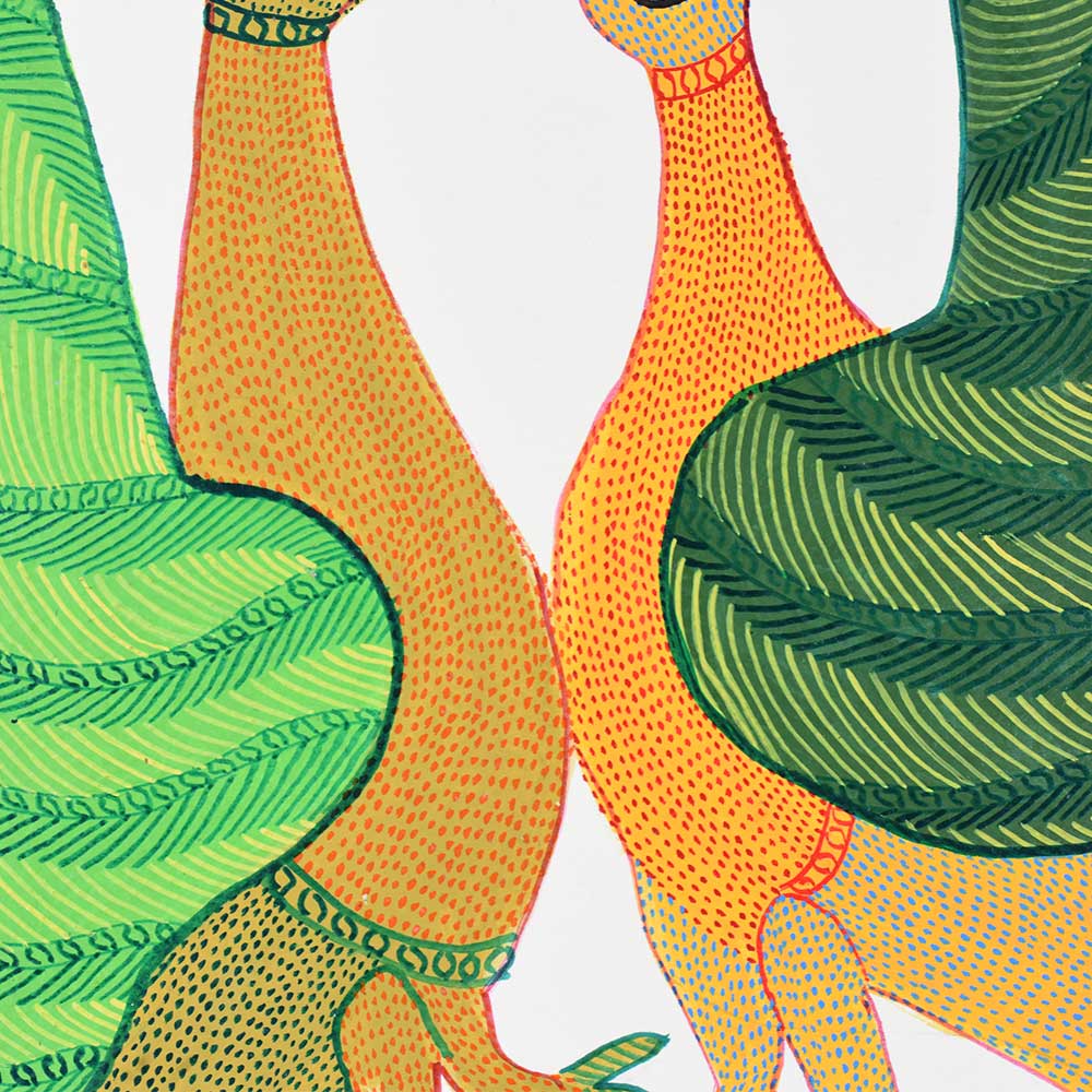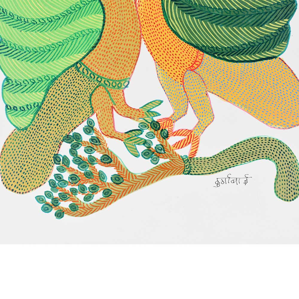 Durgabai Vyam's acrylic painting on paper, featuring two peacocks perched on a stem, exemplifies the vibrant and intricate style of Gond art—a traditional tribal art form from Madhya Pradesh, India. In this artwork, the peacocks, symbols of beauty and grace, are depicted with elaborate patterns and vivid colors, reflecting the artist's deep connection to her cultural heritage. Durgabai Vyam, born in 1973 in Barbaspur, Madhya Pradesh, is a distinguished artist renowned for her contributions to Gond painting without frame. She began her artistic journey at the age of six, learning the art of digna from her mother—a ritual of painting geometric patterns during weddings and harvest festivals. Her early works were well-received within her community. Over the years, Durgabai has created paintings for various publications and exhibited her works both nationally and internationally. In 2022, she was honored with the Padma Shri, India's fourth-highest civilian award, recognizing her exceptional contributions to the arts.
