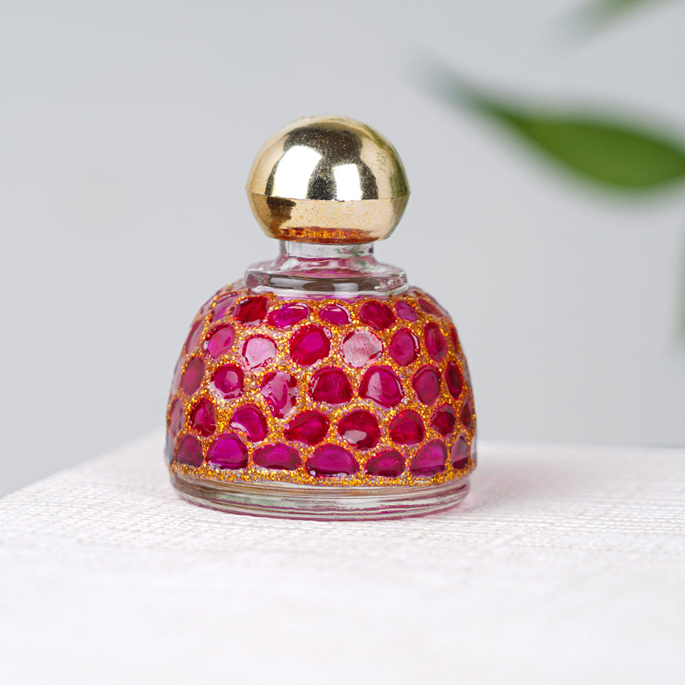 An exquisite glass bottle that is a stunning addition to any collection of decorative perfume bottles. Handmade by skilled Indian craftsmen, this pink bottle features intricate golden sparkles carved into its glass, making it a true work of art. The bottle is sealed with a golden-coloured knob, adding a touch of luxury to its already elegant appearance. This premium perfume bottle is not just a decorative piece, but also practical, as it can be used to store your favourite perfume or oil. The design carved into the glass is a testament to the craftsmen's skill, showcasing a delicate and intricate pattern that adds to the bottle's beauty. This decorative perfume bottle can be placed on a table or shelf to add a touch of sophistication to any room. It makes for a thoughtful and lovely gift for special or festive occasions, such as birthdays or weddings. So, whether you're adding it to your collection of perfume decant bottles or giving it as a gift, this handmade pink and golden sparkle glass bottle is sure to impress.