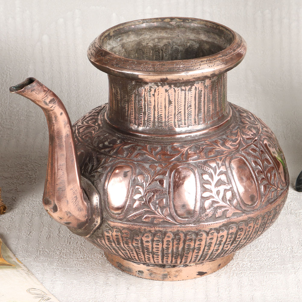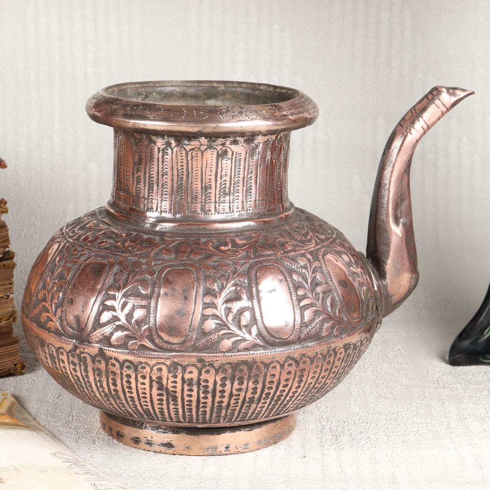 This Copper Water Pot with an enchanting spout is adorned with intricate designs in an antique brown finish. This masterpiece is meticulously handcrafted by highly talented Indian craftsmen from the historic city of Hyderabad, renowned for its rich heritage in Islamic artistry. Crafted from high-quality copper, this pot exudes elegance and sophistication, making it a versatile addition to any setting. Whether adorning your home, office, restaurant, hotel, or cafe, this pot adds a touch of opulence to your decor. Its timeless beauty transcends contemporary and traditional spaces, making it a captivating centerpiece. Beyond its aesthetic appeal, this copper pot serves various purposes. Use it to display fresh flowers, enhancing the ambiance with its rustic charm. Alternatively, employ it during rituals and ceremonies to hold sacred water, embracing tradition and spirituality. It also makes for a thoughtful gift, perfect for special, festive, or auspicious occasions, allowing you to share the allure of this artful creation with your family, friends or relatives.