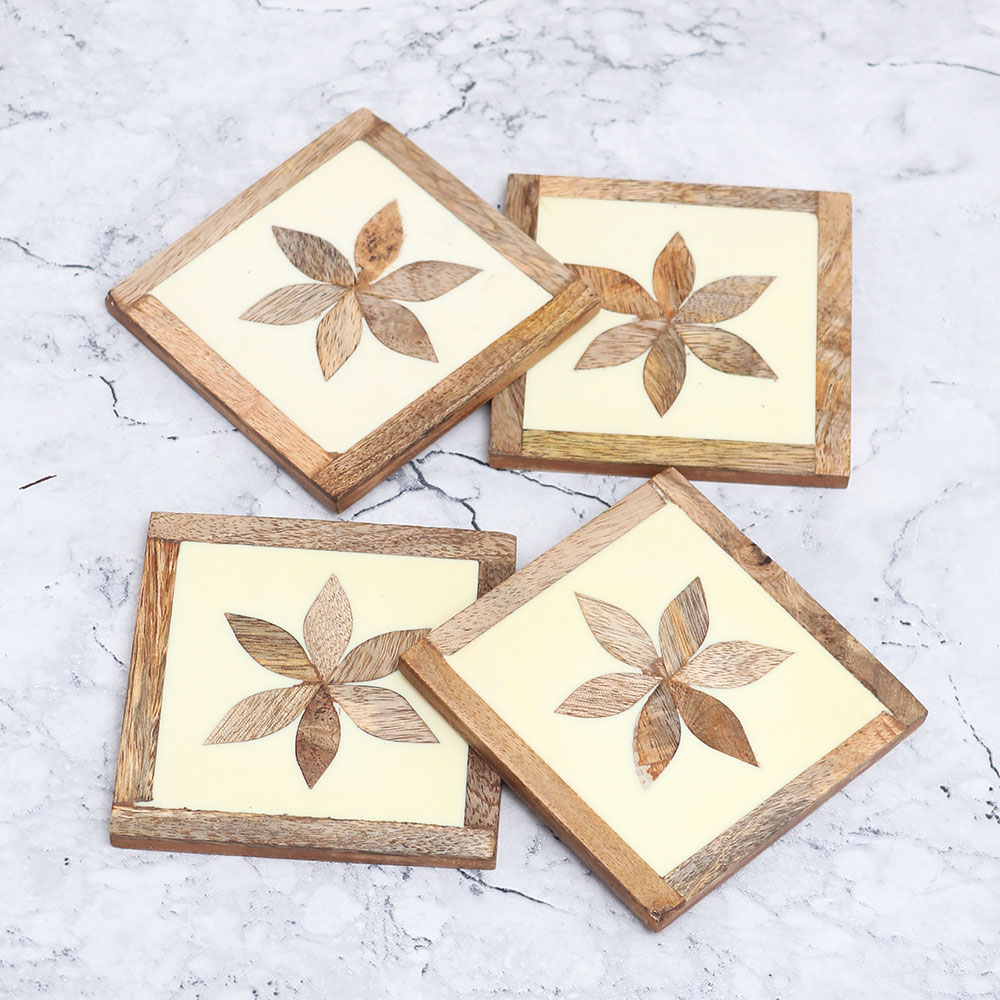 Enhance your home decoration with a Wooden Tea Coaster Set which is a masterpiece crafted from high-quality wood by professional artisans from India. This set includes 4 coasters, each designed with a timeless square shape that brings elegance to any surface. The coasters feature a cream background with a brown colour border, enhancing their aesthetic appeal. In the center of each coaster, a beautifully engraved flower adds a touch of artistry, making these coasters not just functional but also decorative pieces for your home or office. They are also perfect for holding water, tea, juice, or coffee glasses, protecting your surfaces from unsightly stains. Whether you\'re at home, in the office, at a restaurant, hotel, or cafe, these coasters will add a touch of sophistication to your beverage experience. This Wooden Tea Coaster Set also makes an ideal gift for your loved fours on special or festive occasions. Its timeless design and expert craftsmanship ensure that it will be cherished for years to come.