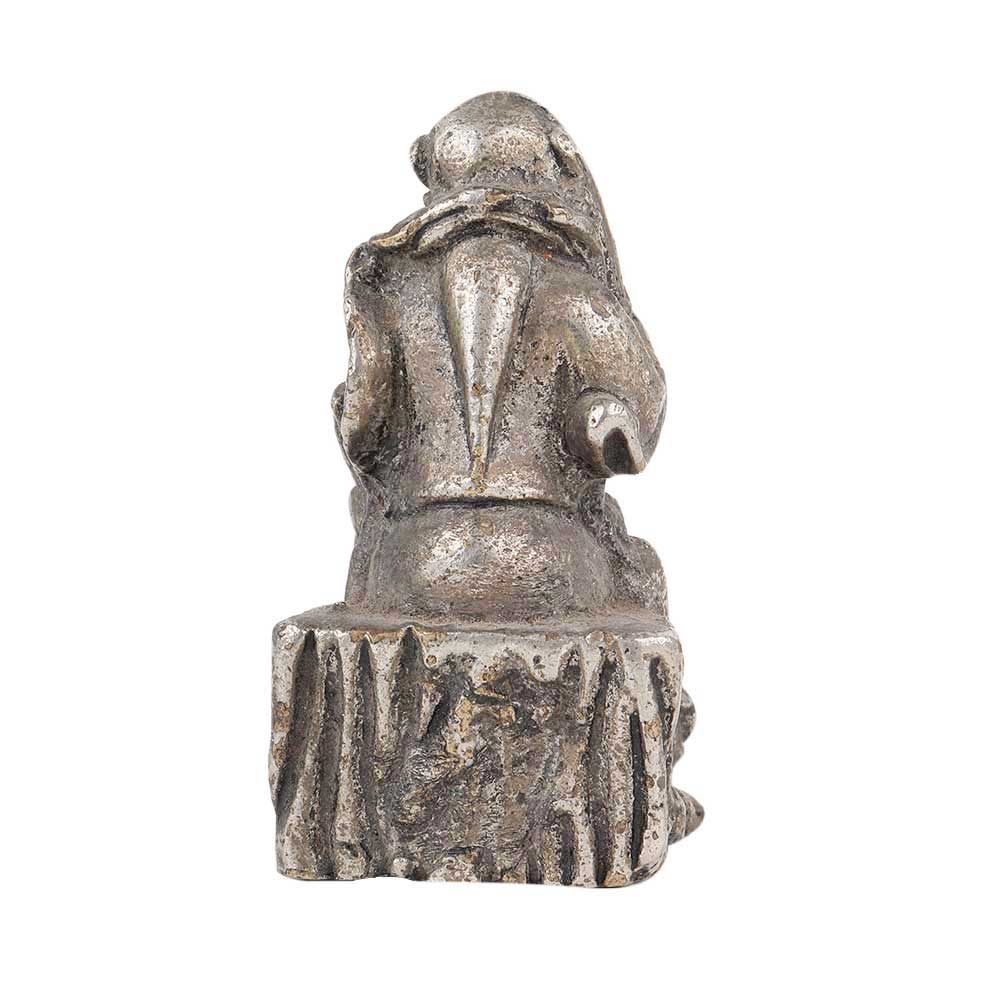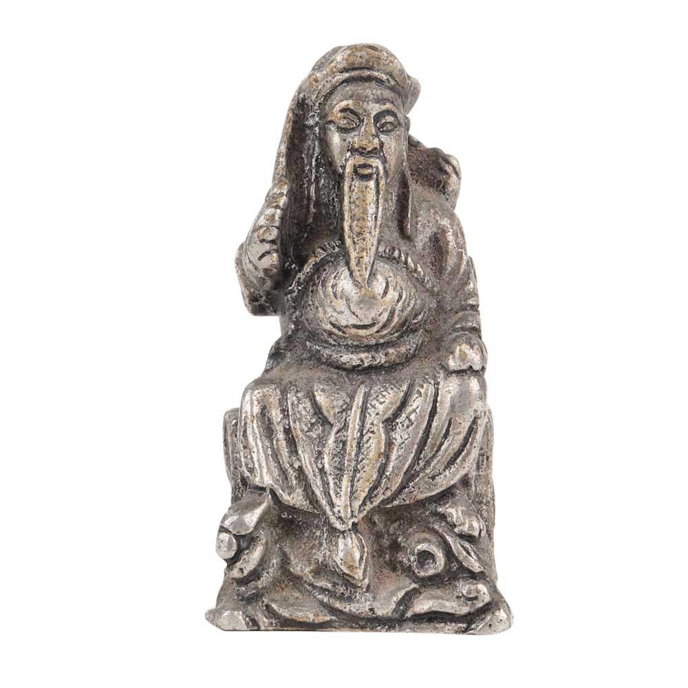 A very detailed Silver Color Aluminum feng shui figurine of wise man who looks Chinese wearing a turban and flaunts a long beard . He holds a sword in one hand for wealth and good luck he is seated on a stoned platform and placing this statue in your home brings good fortune. Gift it to your near and ear ones on special occasion and functions.