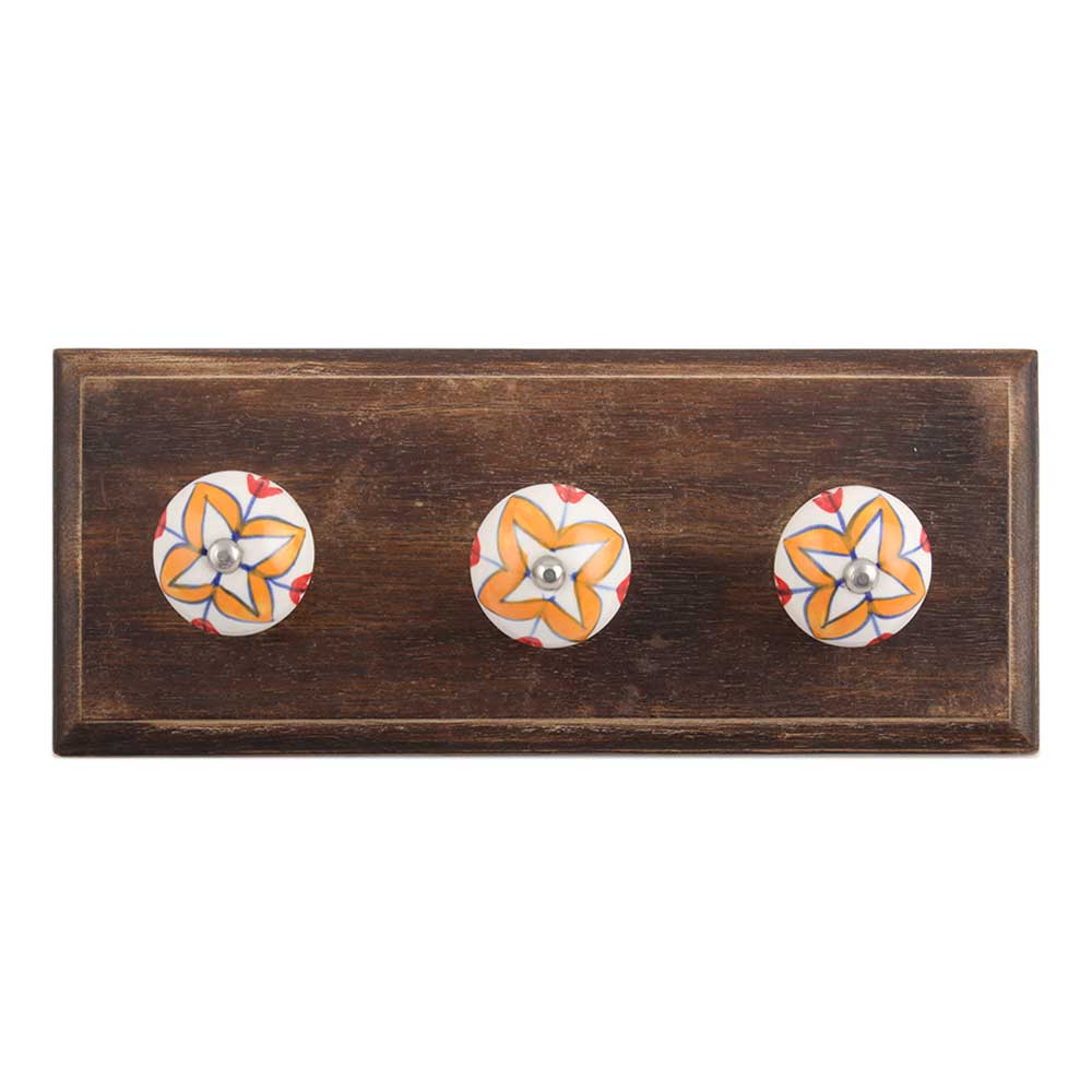 Amaryllis Mustard Flower Ceramic Wooden Hook. A Perfect Complement to the Soft Tone of the Wood are these White Traditional Hat & Coat Hook Made of Genuine Porcelain and Brass. It can be use to Hang Jewellery, Leashes, Towels, Scarves, Light Weight Sweaters, Caps Etc.