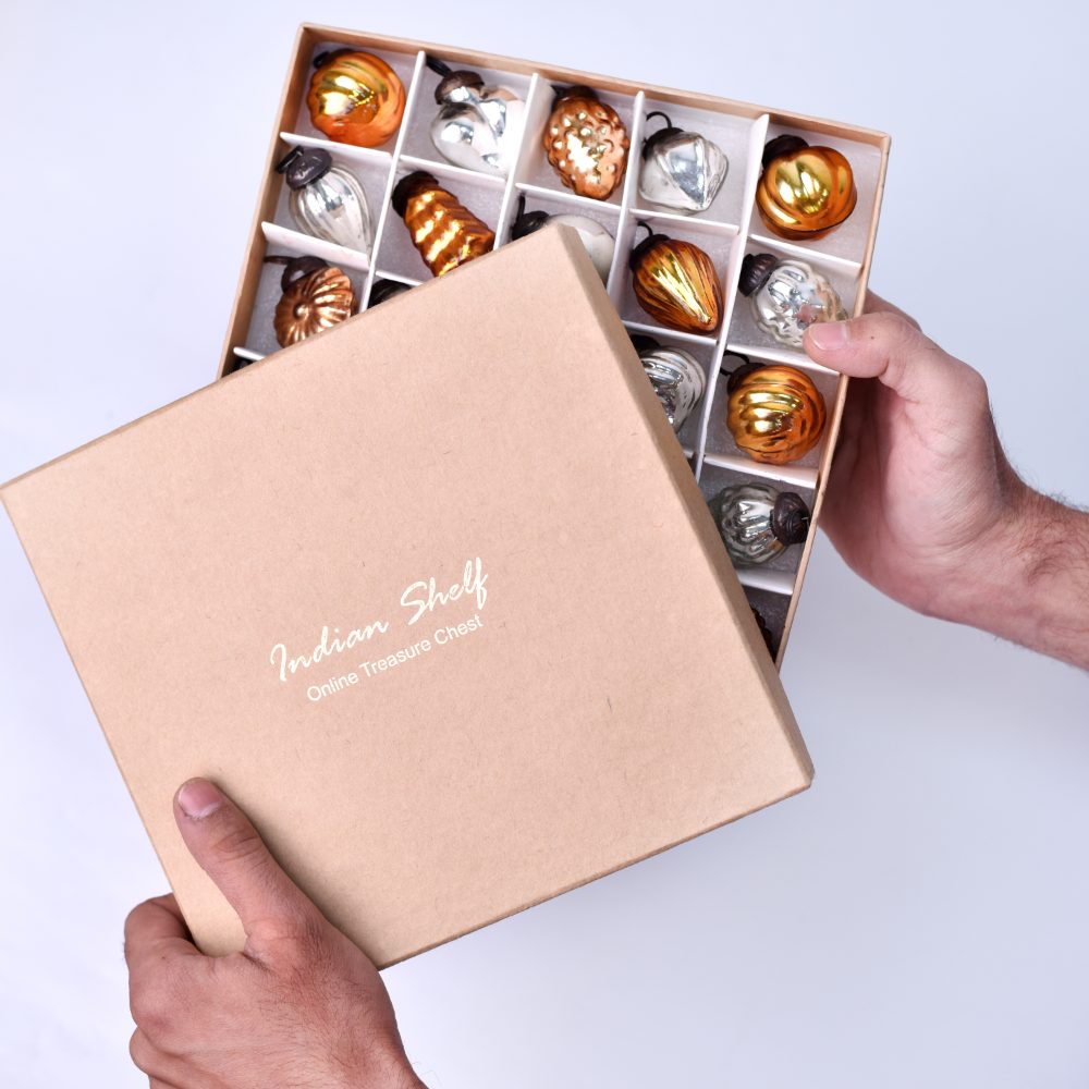 Buy Amber and Silver Glass Christmas ornaments which are unique and handcrafted masterpiece. Crafted by highly skilled Indian artisans, these ornaments are a celebration of craftsmanship, tradition, and elegance. These stunning ornaments come in a variety of shapes, from classic spheres to intricate designs, ensuring a diverse and captivating display on your Christmas tree. The lush Green and gleaming Golden colours blend harmoniously, adding a touch of opulence to your holiday decorations. Versatile and enchanting, these ornaments aren't just limited to Christmas. They make a delightful addition to weddings, bridal showers, and other special occasions, elevating the ambiance with their radiant charm. Hang them in your home or garden to infuse every space with a touch of festive cheer. These handcrafted treasures also make for exceptional gifts. Share the joy and craftsmanship with your loved ones on special or festive occasions, leaving a lasting impression of your thoughtfulness and appreciation for beauty.