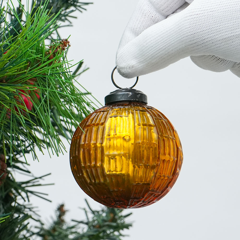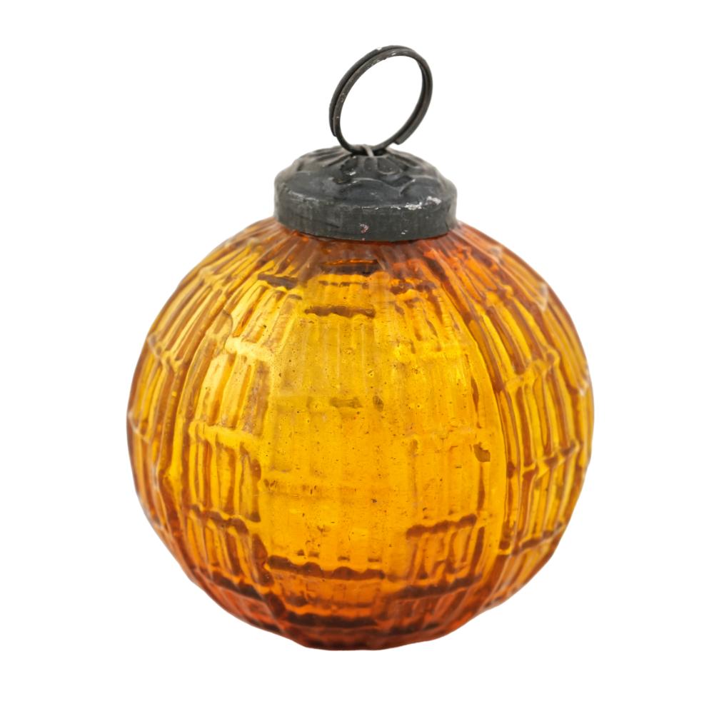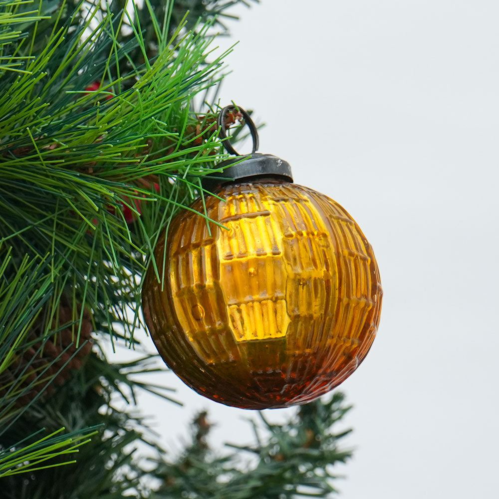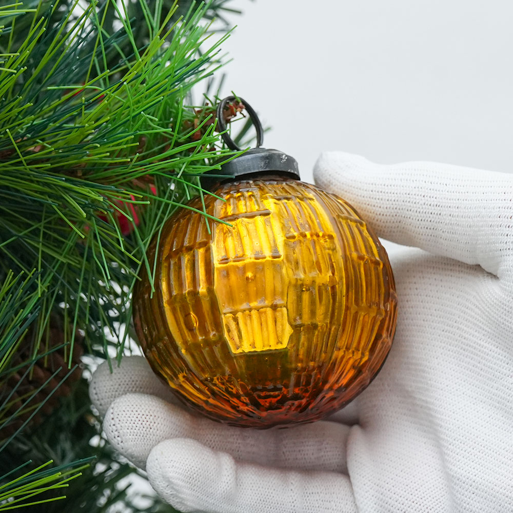 Amber Vintage Kugel Round Glass Christmas Ornament. Crafted from high-quality glass with a smooth glossy finish, this decorative bauble adds a classic and festive touch to Christmas trees, wreaths, and holiday displays.