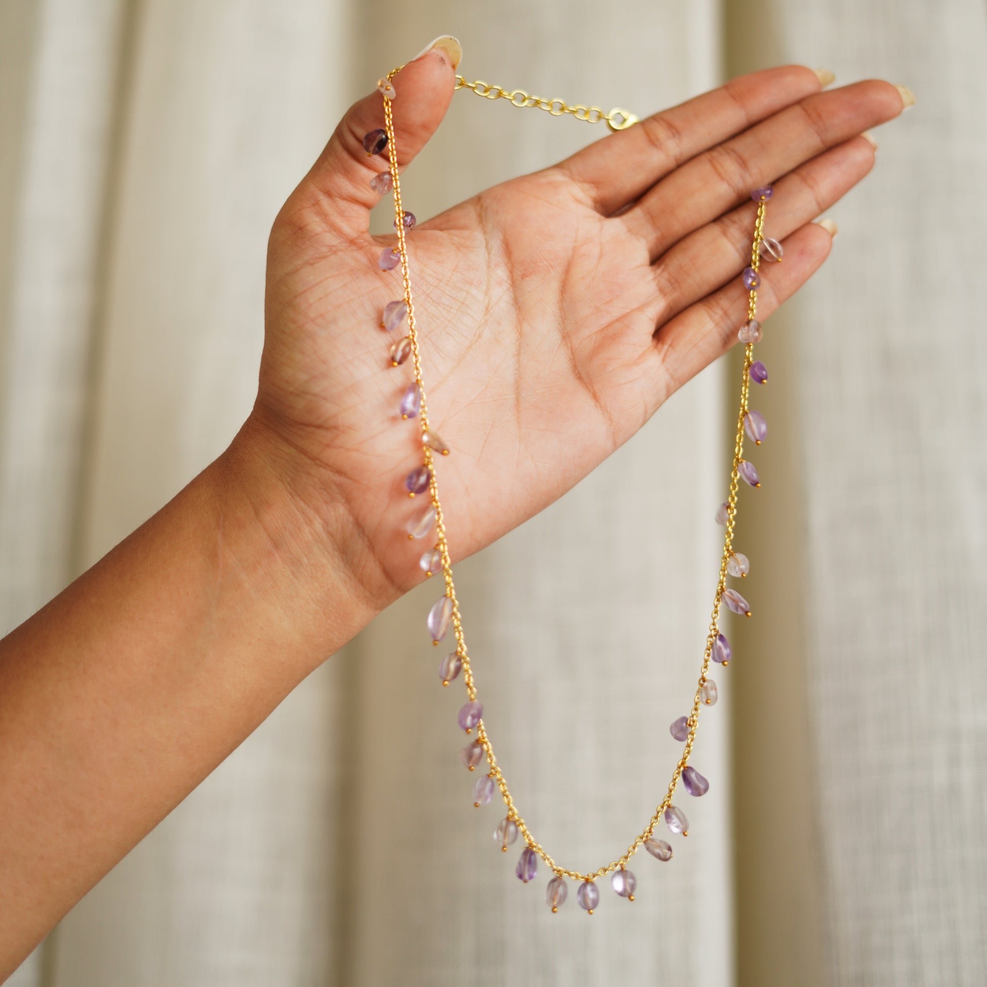 This Amethyst Gemstone Drop Necklace captures the calming beauty of natural purple quartz in an elegant, handcrafted design. Made from solid brass and finished with a rich 22K gold plating, the necklace features a polished amethyst drop that radiates soothing, spiritual energy. At 22 inches, it drapes gracefully across the neckline, creating a refined, elongated silhouette. Handcrafted by skilled artisans, this piece blends luxury, healing symbolism, and timeless craftsmanship—perfect for women who adore meaningful gemstone jewelry.