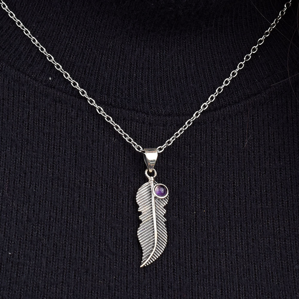 Elegant Amethyst Stone Feather 92.5 Sterling Silver Pendant where the stone is embedded into a feather shape pendant with a ring on top so that it can be worn in a chain. Birthday, Anniversary, Valentine, Christmas and Celebrations for your near and dear ones.