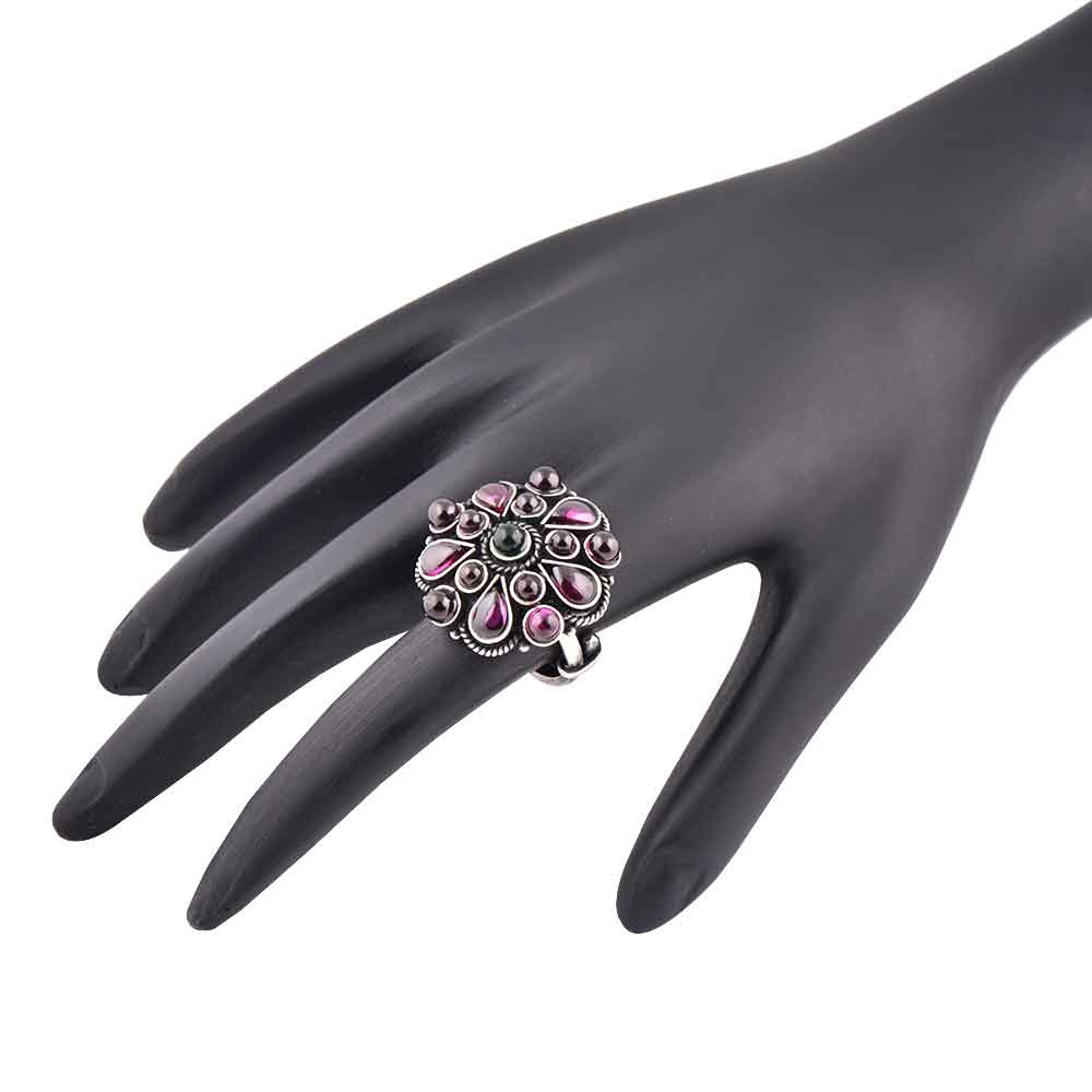 Many amethyst stones in different shapes and sizes studded 92.5 Sterling Silver Ring with a round green onyx stone adds a touch of class and elegance to ordinary dress or outfit such as lehengas, suits, suits , dress or gowns.