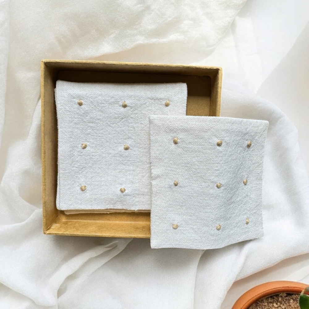 Anthophile Coaster Set of 2 , The Anthophile Collection coaster, combines timeless Chikankari embroidery with floral elegance, perfect for adding a touch of nature-inspired beauty to your table. Each handcrafted coaster is adorned with delicate floral motifs, reflecting the love of an anthophile for flowers. Ideal for protecting your surfaces while enhancing your decor, these coasters bring a subtle charm to any setting
