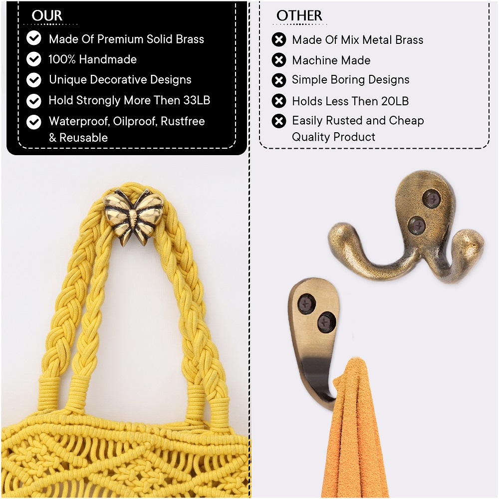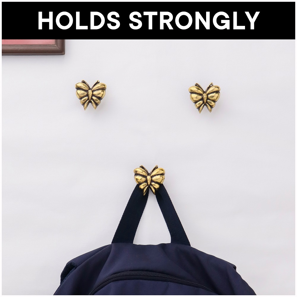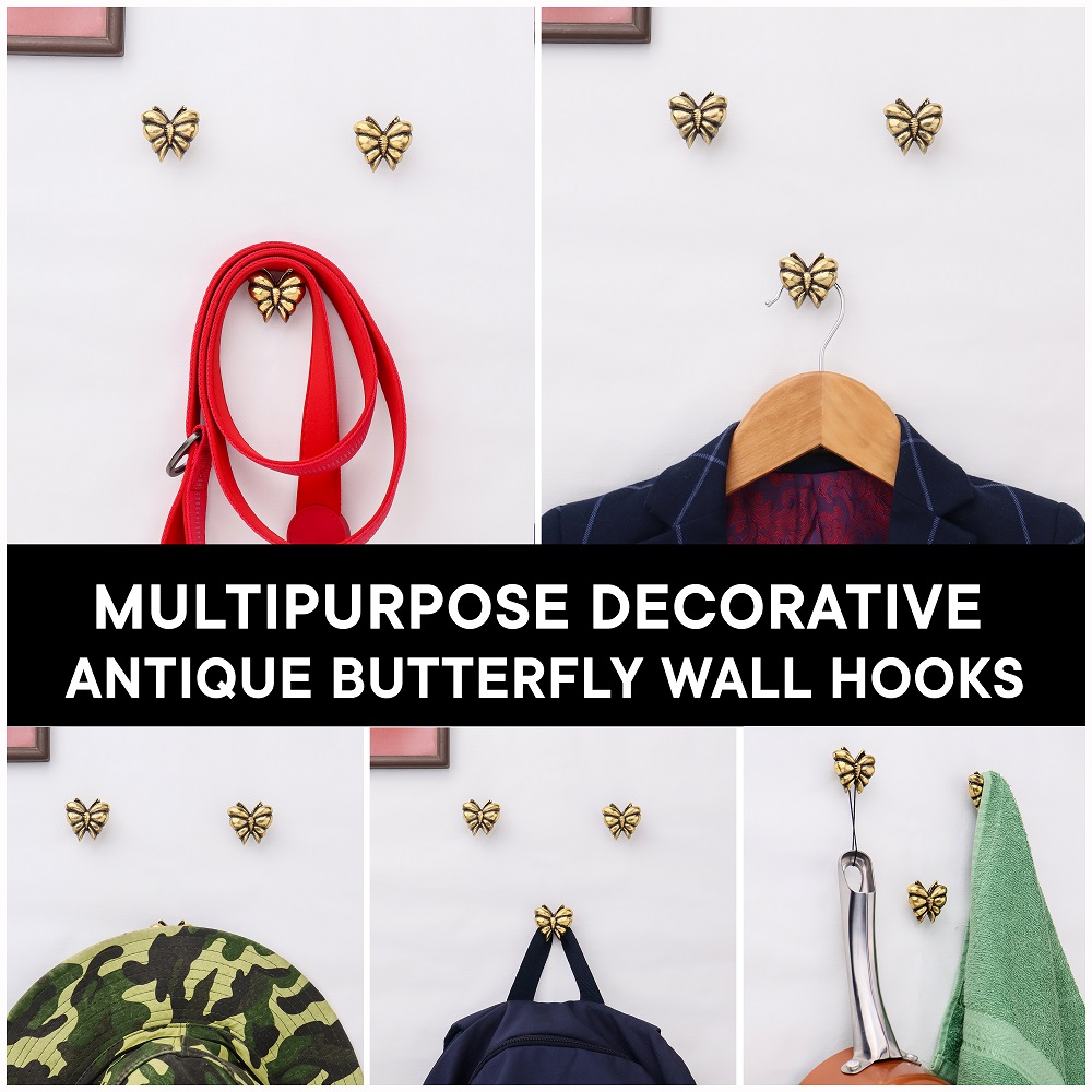 Antique Brass Butterfly Shaped Wall Hooks Set of 3. This Hook is Strong Enough to Hold Your Cloths, Keys, Tea Cups, Coffee Mugs, Hand Towels Etc.