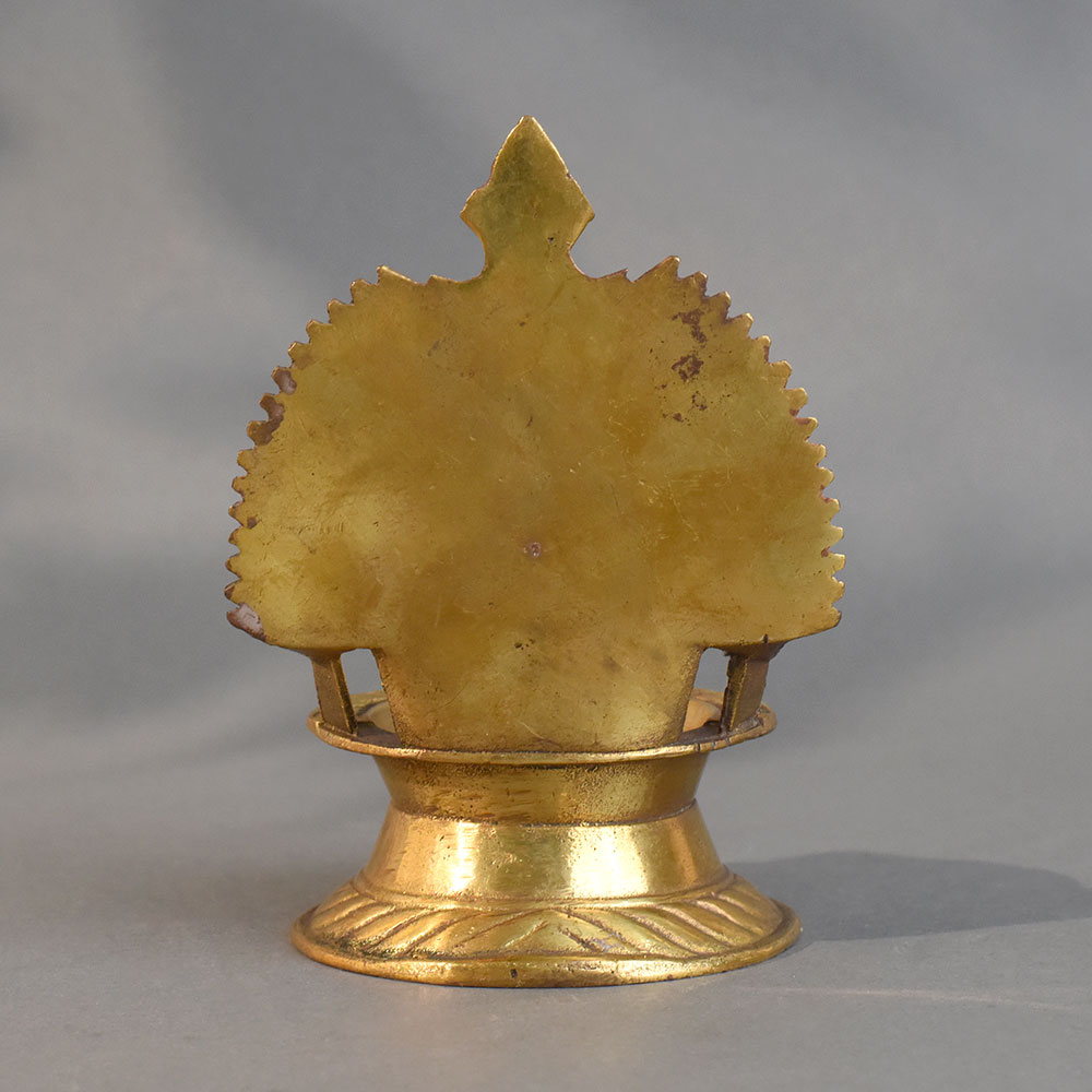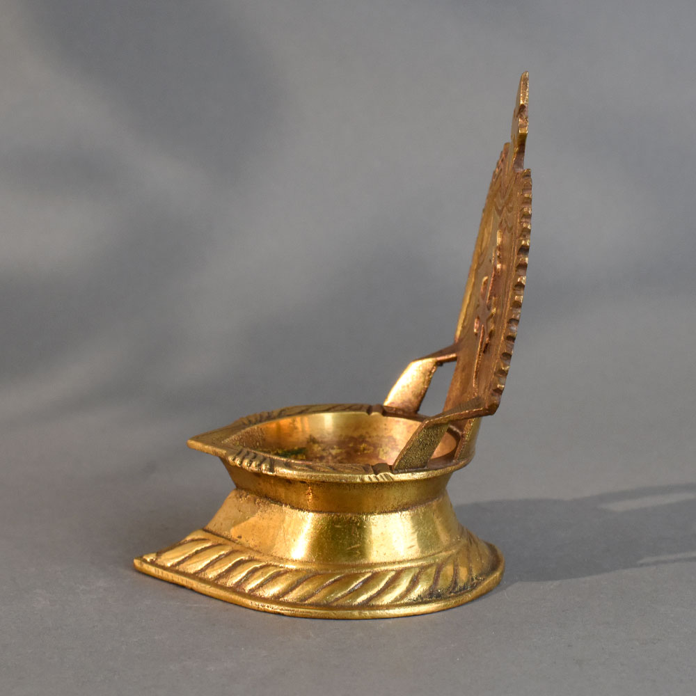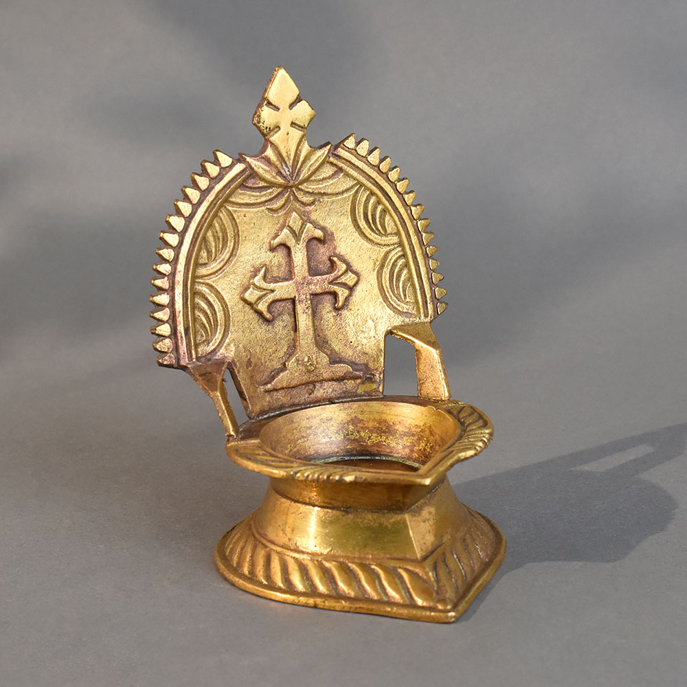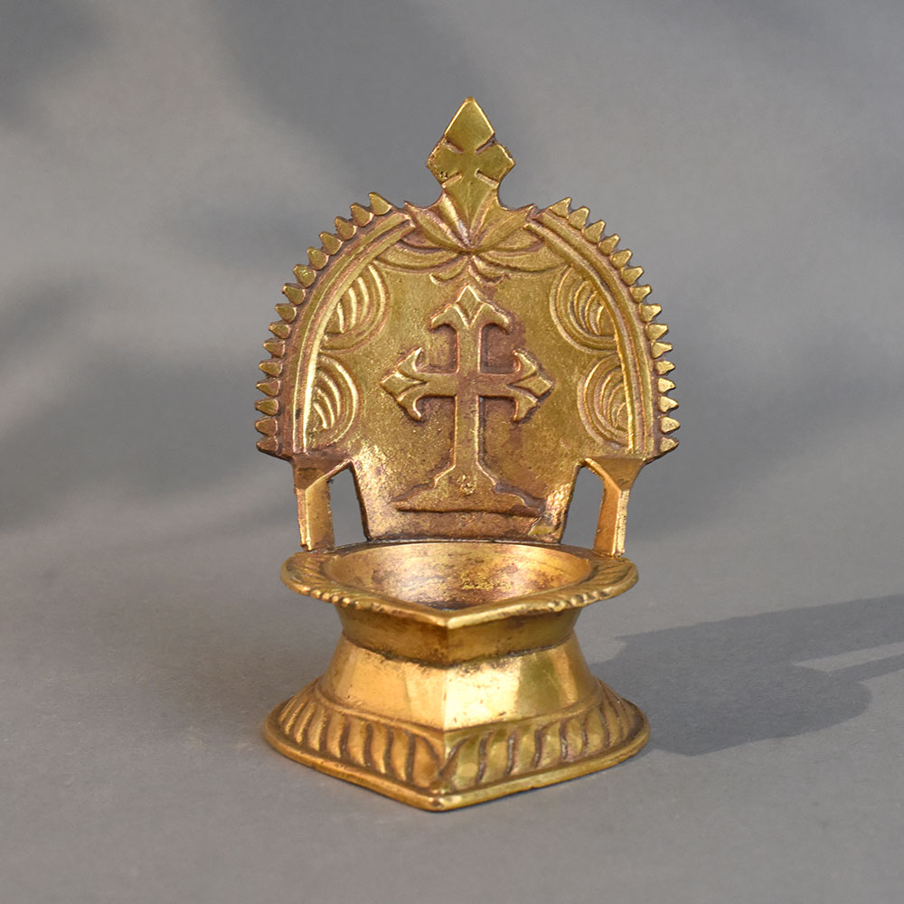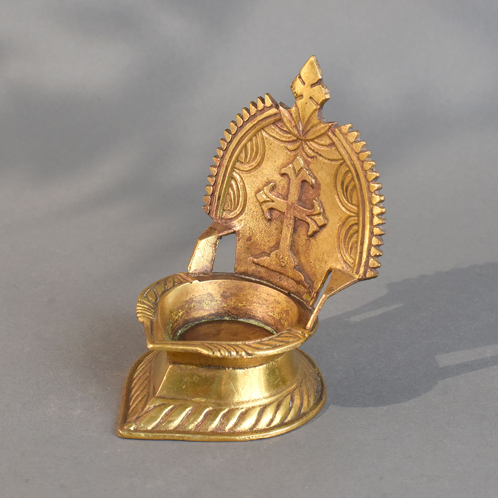 This vintage brass South Indian diya is a remarkable piece of traditional art and devotion. Handcrafted from solid brass, it features a beautifully engraved cross design on the backplate, highlighted with ornate patterns and fine detailing. The diya is designed to hold oil and wick, making it ideal for pooja rituals, prayer ceremonies, or festive occasions. Its antique golden finish adds timeless charm, symbolizing spirituality and cultural heritage. This diya not only serves as a sacred lamp but also doubles as a decorative collectible, bringing a traditional touch to your home Decor. A perfect blend of artistry and devotion, it makes an excellent choice for gifting during weddings, housewarmings, or religious celebrations.