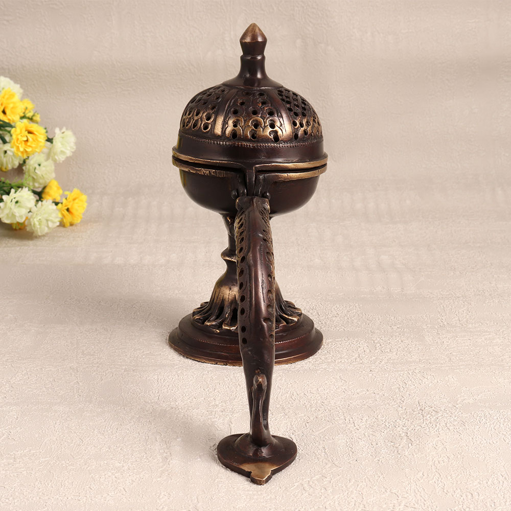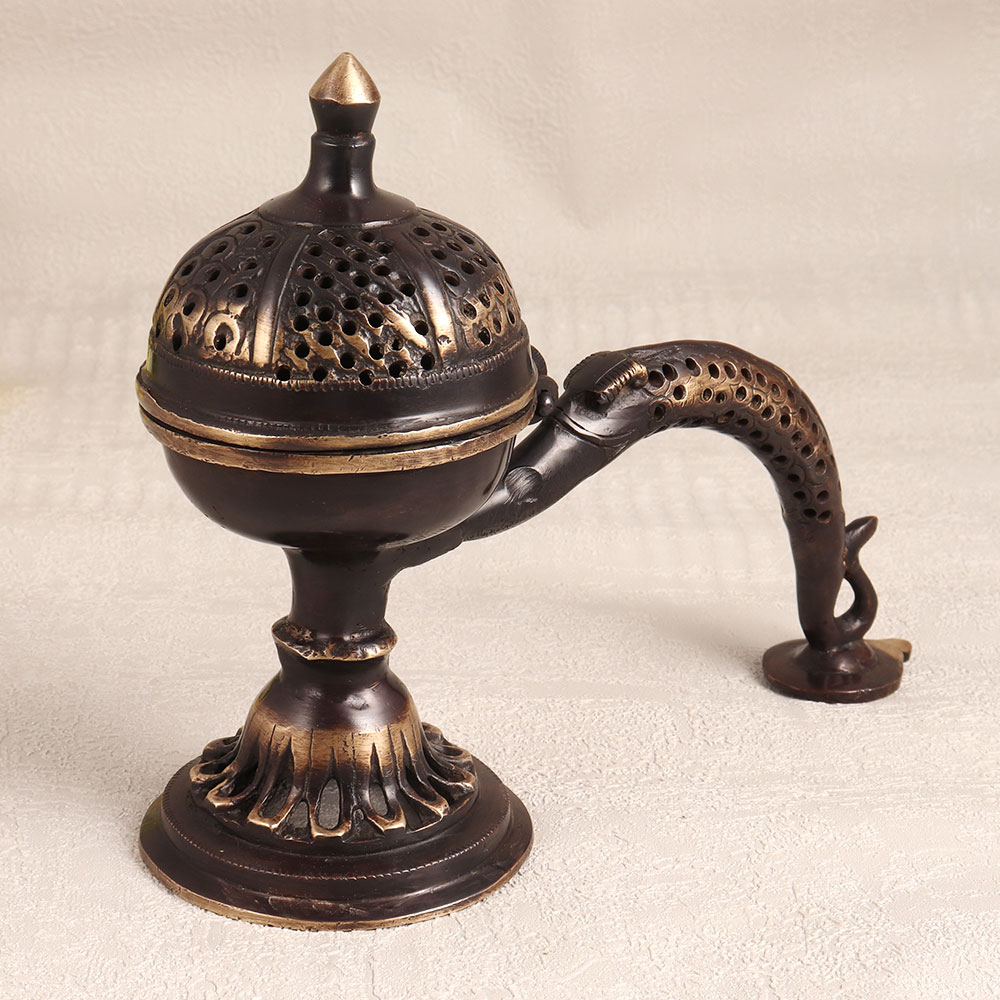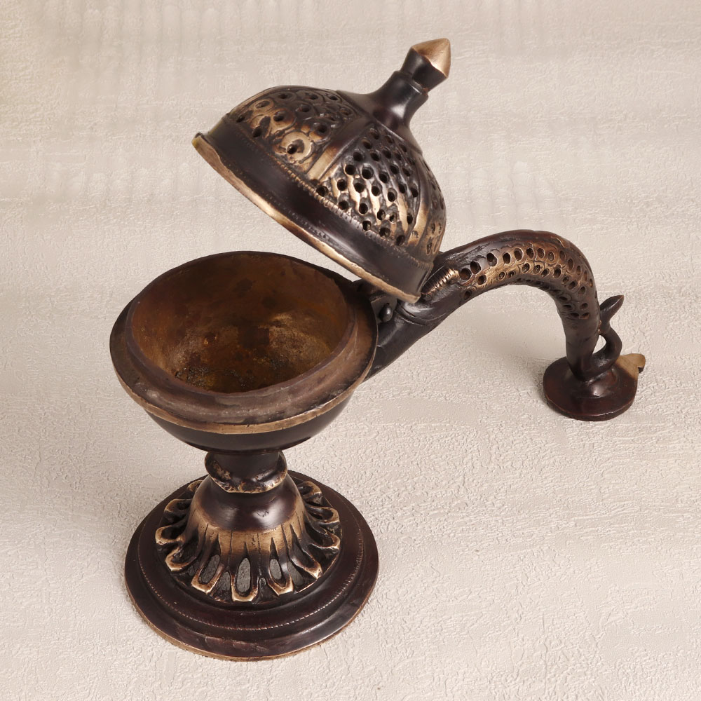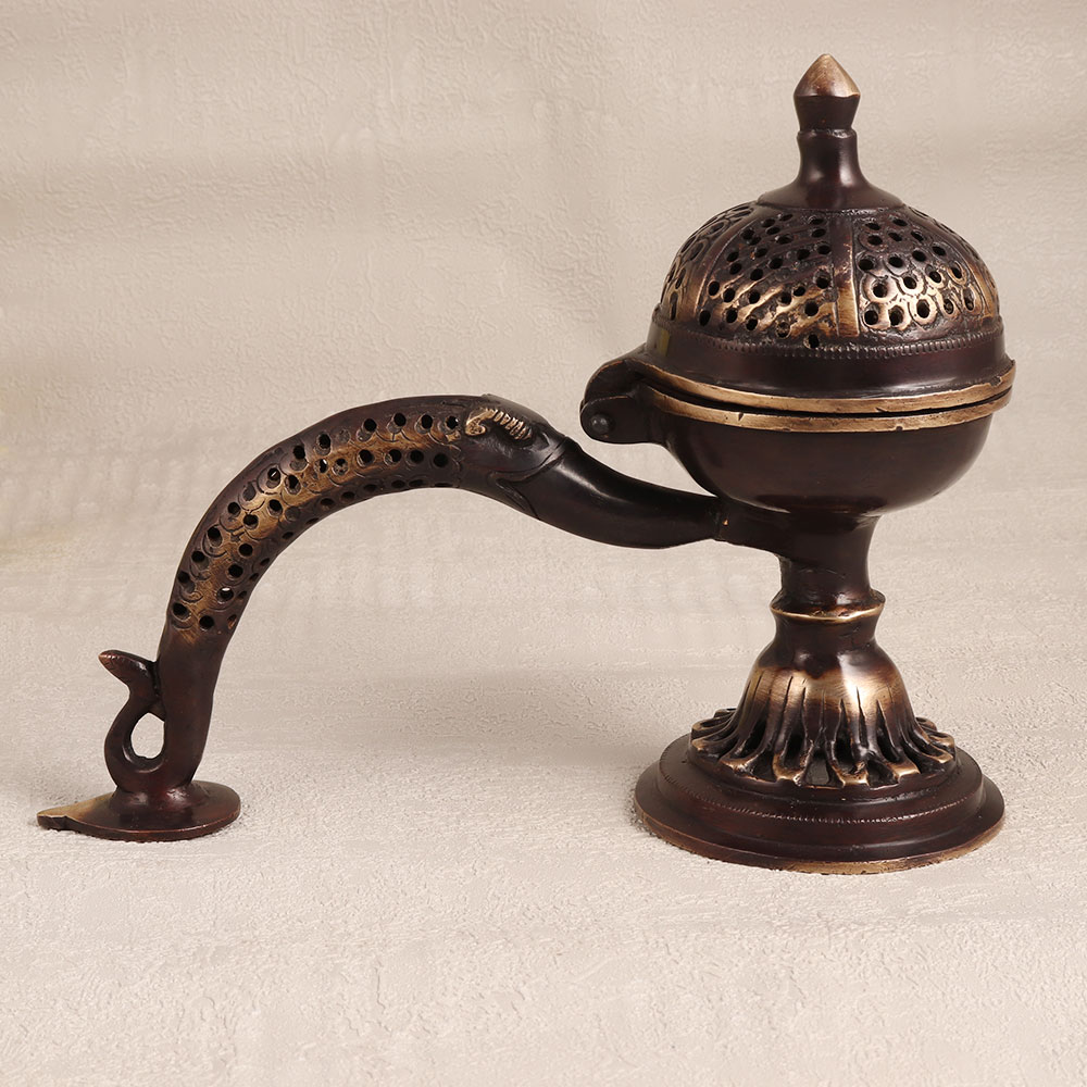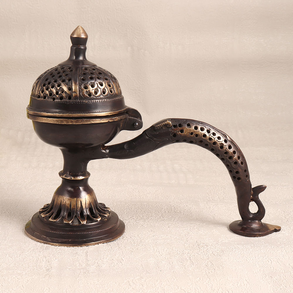 Buy a Brass Camphor Burner or Aarti Lamp online and get a hassle free delivery at your doorstep. Handmade by skilled Indian artisans, this stunning piece showcases their dedication to craftsmanship and attention to detail. The antique brown finish adds a touch of vintage charm that seamlessly complements any decor. Made from high-quality brass, this burner exudes elegance and durability, promising to last for generations. Its long handle allows for safe and convenient use, whether in the comfort of your home, the serenity of your office, the welcoming ambiance of a hotel, the cosy atmosphere of a cafe, or the warm surroundings of your shop or restaurant's prayer room. This piece serves a dual purpose, as it not only functions as a beautiful decorative item but also as a source of positive energy, spreading tranquillity and serenity in its surroundings. Whether you're celebrating a special occasion, a festive festival, or an auspicious moment, this Brass Camphor Burner makes for an ideal gift to your family, friends or relatives, symbolizing your well wishes and blessings.