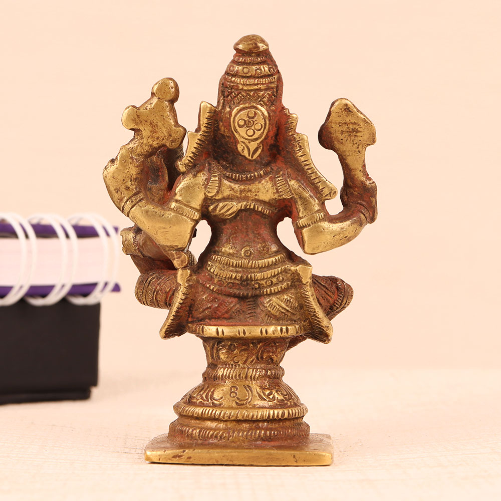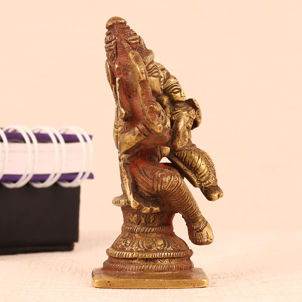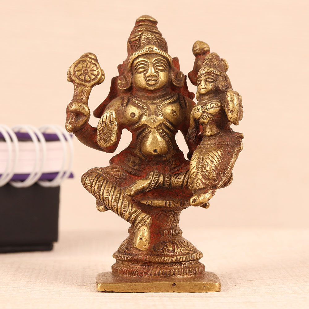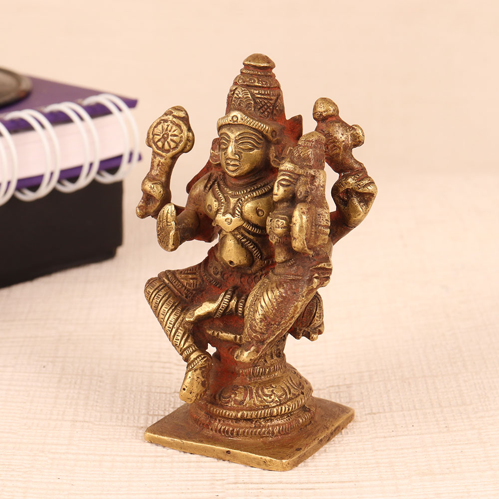 Experience the divine essence of Hindu mythology with our brass statue of Lord Vishnu and Goddess Lakshmi, a masterpiece of artistry and spirituality. Crafted by highly skilled Indian artisans, this awe-inspiring statue captures the essence of devotion in every intricate detail. Lord Vishnu, the preserver of the universe, sits majestically on a platform, while the Goddess of wealth and prosperity, Lakshmi, graces his left lap. The antique brown finish adds a timeless charm, making it an ideal addition to your sacred space, whether at home, in your office, restaurant, hotel, cafe, or shop's prayer room. This handcrafted masterpiece not only serves as an object of worship but also doubles as a captivating decoration. Its elegance and craftsmanship make it a cherished item for collectors of vintage art. Moreover, this stunning brass statue serves as a heart-warming gift for your family, friends or relatives on special, festive, or auspicious occasions. It carries with it the blessings of Lord Vishnu and the abundance of Goddess Lakshmi, making it a thoughtful and meaningful gesture for weddings, housewarmings, or religious celebrations.