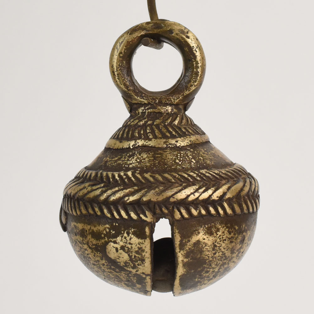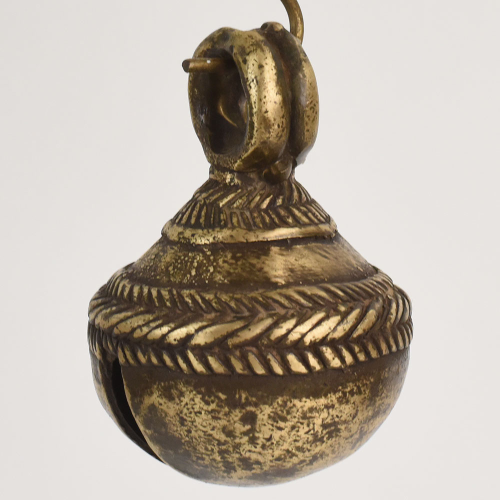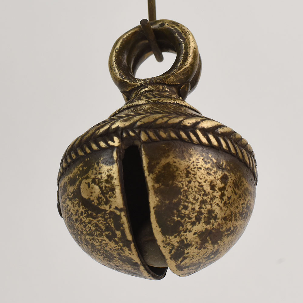 This antique bell metal cow bell from Northern India is a charming artifact that reflects centuries-old traditions of rural craftsmanship. Shaped entirely by hand, it features a rounded form with a thick loop top designed to attach securely to cattle harnesses. Its naturally aged patina displays a beautiful mixture of dark bronze, warm gold, and weathered markings, giving the bell deep character and authenticity. The textured surface reveals the artistry and practical purpose behind its creation, making it an exceptional piece for rustic, farmhouse, or globally inspired dcor. Display it as a standalone object, incorporate it into wall dcor, or use it in a curated collection of artisanal items. This bell carries the essence of pastoral life from Northern India and adds an earthy aesthetic to interior spaces.