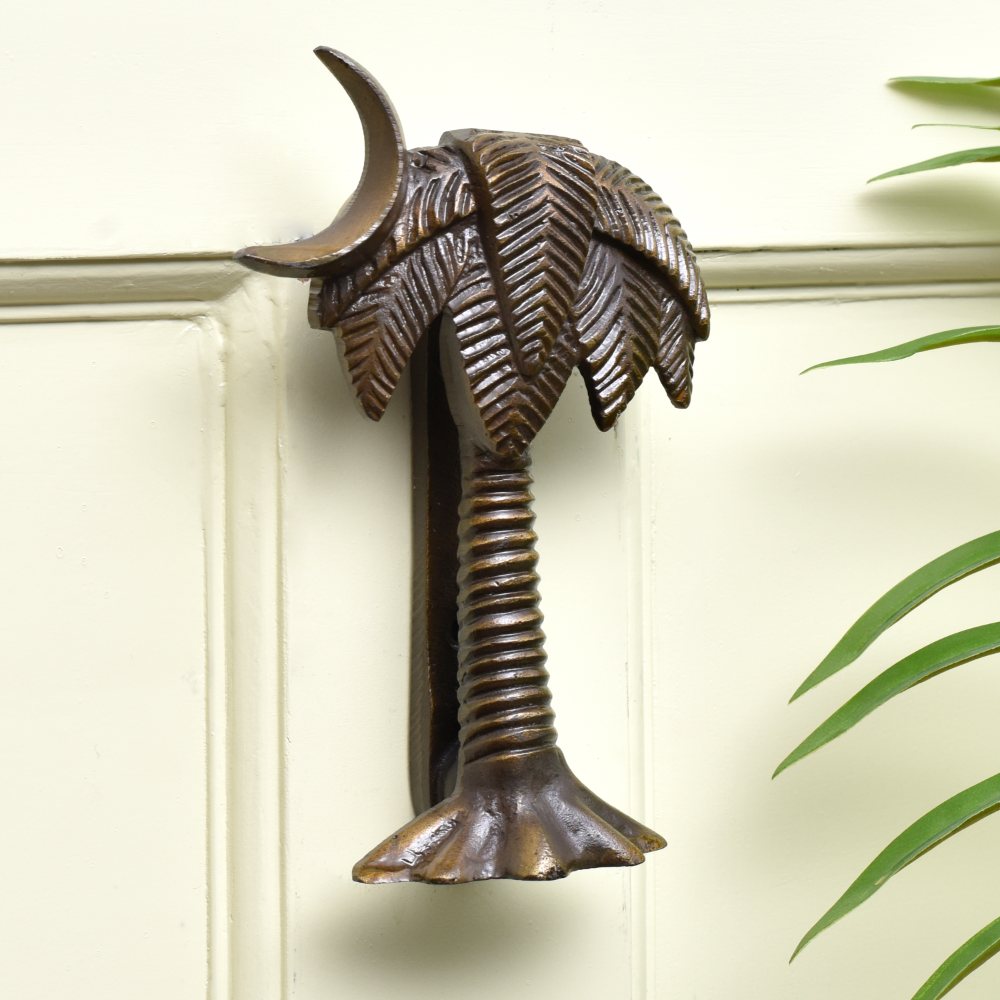 The antique patina finish not only gives this door knocker a vintage charm but also highlights its connection to nature. The palm tree design exudes tropical elegance and relaxation, while the sturdy iron construction ensures its lasting durability. It's the perfect blend of beauty and practicality.