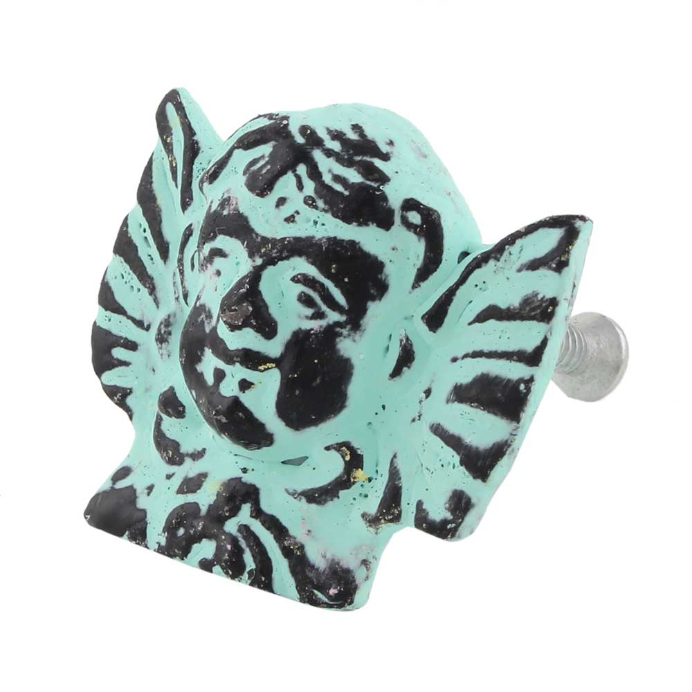 The Aqua Angel Distressed Iron Cabinet Knob features a beautifully crafted angel design in a calming aqua hue. Its soft, tranquil color, combined with intricate detailing, offers a gentle yet striking addition to any piece of furniture. Perfect for those seeking a blend of elegance and peaceful charm in their home decor.