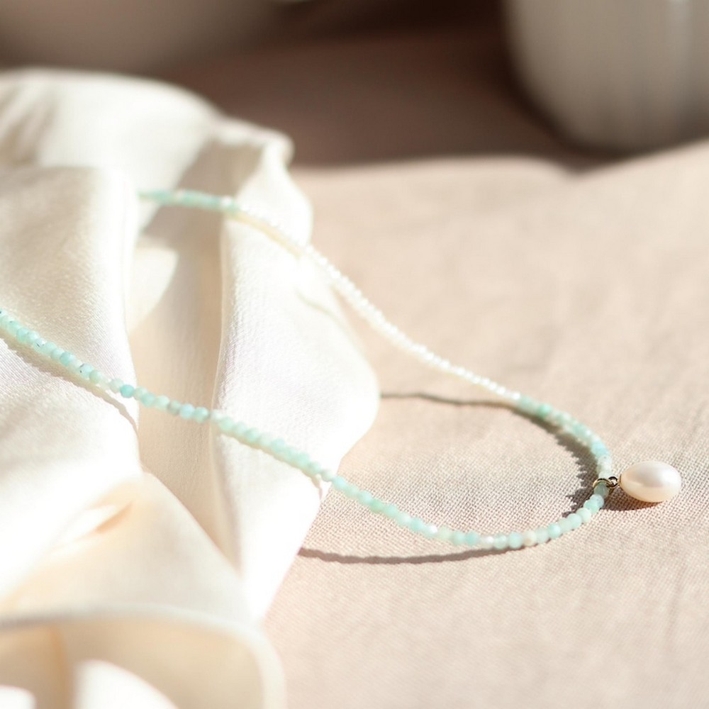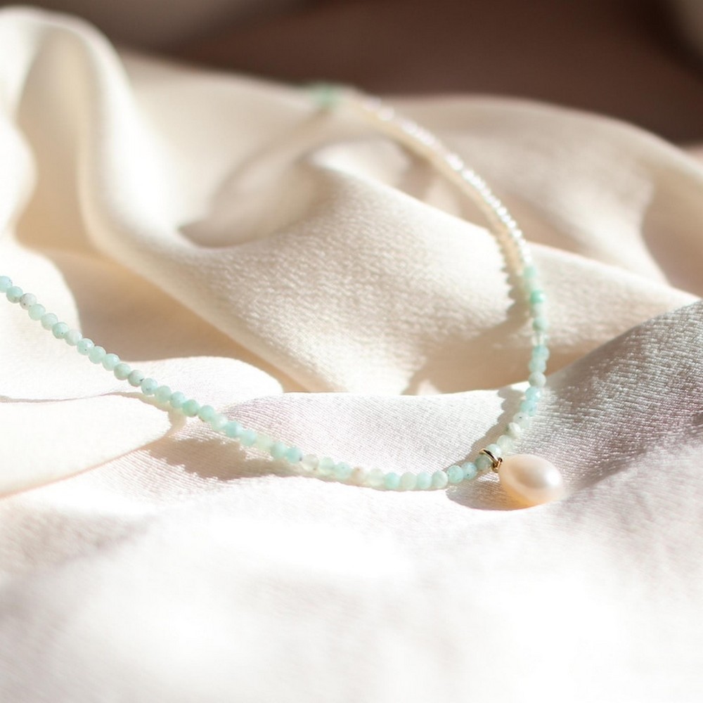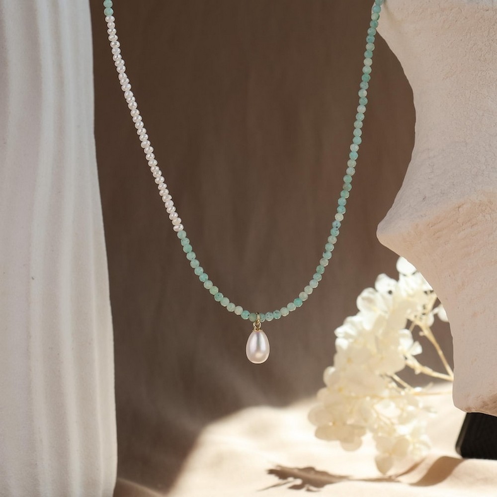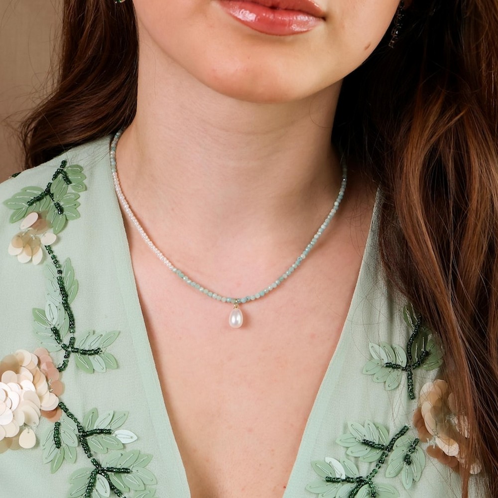Soft, calming, and beautifully refinedthis aquamarine beaded necklace with a freshwater pearl drop pendant brings natural elegance to everyday styling. Hand-strung with smooth aquamarine beads and a luminous teardrop pearl, it offers a gentle blend of colour and classic charm perfect for women who appreciate subtle, graceful jewellery.