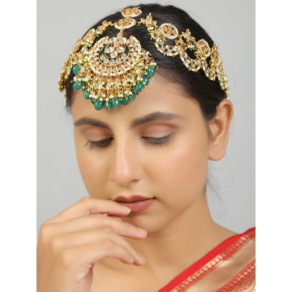 This handmade maang tikka set blends traditional kundan artistry with refined gold-tone structure, creating a statement piece admired by brides, collectors, and cultural stylists.