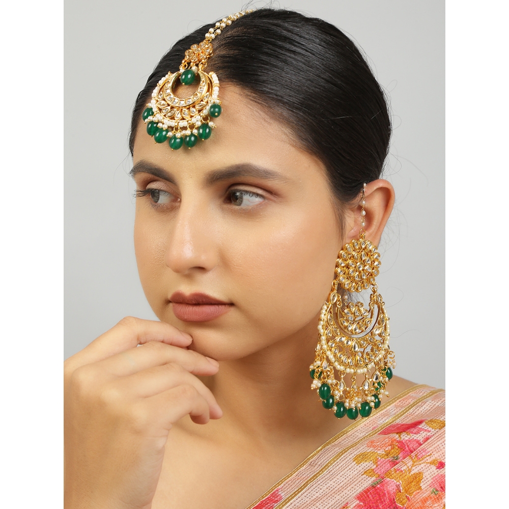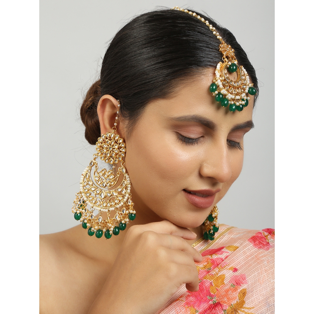 - Includes a pair of ornate chandelier-style earrings and a matching maang tikka