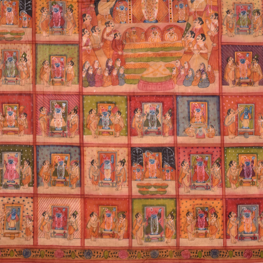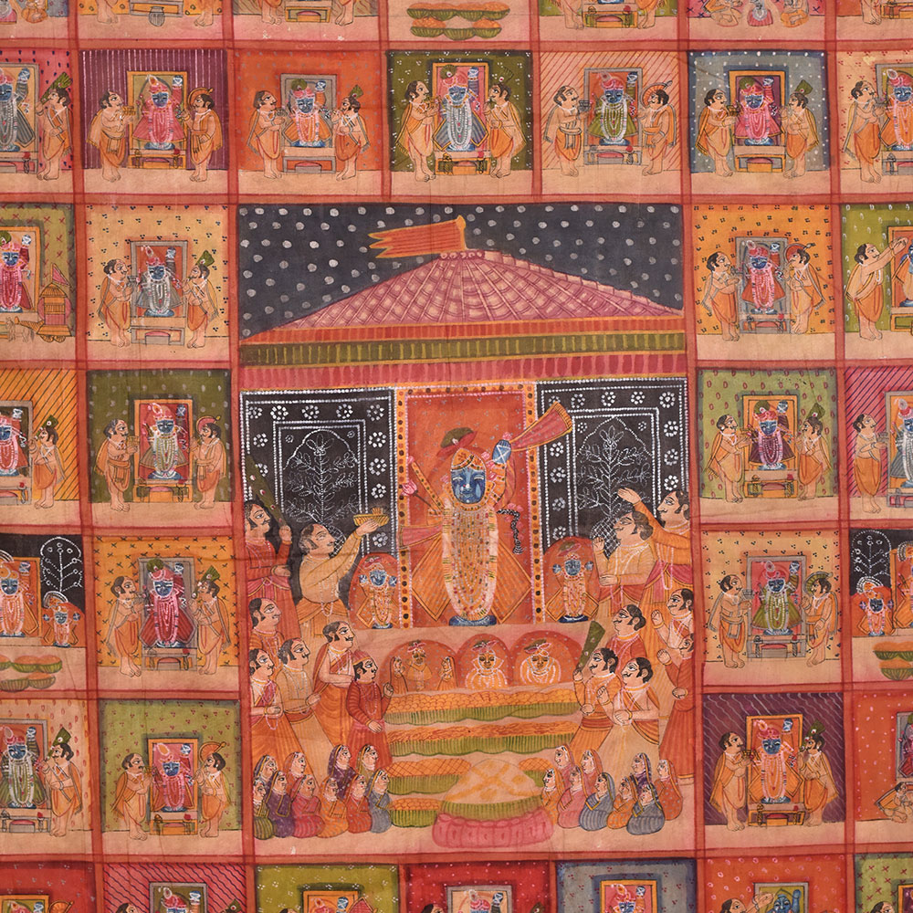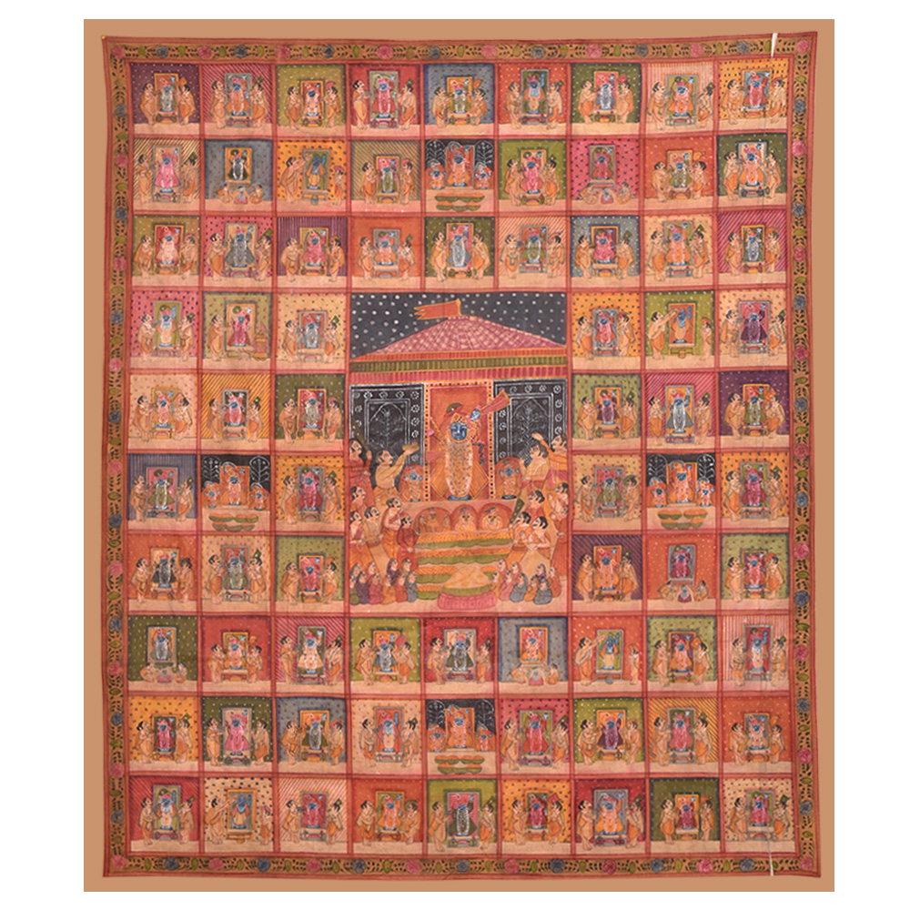 A beautiful Pichwai painting on fabric cloth that is an intricate artwork which showcases Lord Shrinathji. This particular painting depicts Lord Shrinathji in the center, being prayed to by devotees at a temple. Around him are 78 different scenes of Lord Shrinathji at the temple, each being worshipped by two devotees. The painting is a vibrant display of colours, with professional Indian artists having used a variety of hues to create a stunning visual spectacle. The level of detail and intricacy is truly remarkable, with each scene featuring its own unique elements that add to the overall beauty of the painting. This Pichwai painting is perfect for those who wish to adorn their prayer room or temple with a sacred and divine artwork. It is also an auspicious gift for family, friends, or relatives on special or festive occasions such as weddings, birthdays, or religious festivals. Its rich cultural and spiritual significance is sure to make it a cherished and timeless gift for anyone who receives it.