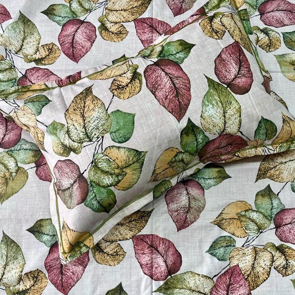 Bring the serene beauty of nature into your home with this Autumn Leaf Print King Size Bedsheet Set. Featuring an elegant design of earthy-toned leaves in shades of green, mustard, and maroon on a soft beige base, this set is a celebration of natural textures and warm hues. Crafted from 100% pure cotton casement fabric, it promises breathable comfort and a refined aesthetic.This 3-piece set includes one flat (non-fitted) bedsheet and two matching pillow covers that complete the rustic yet sophisticated look. Perfect for seasonal styling or gifting, it combines softness with durability for everyday use.